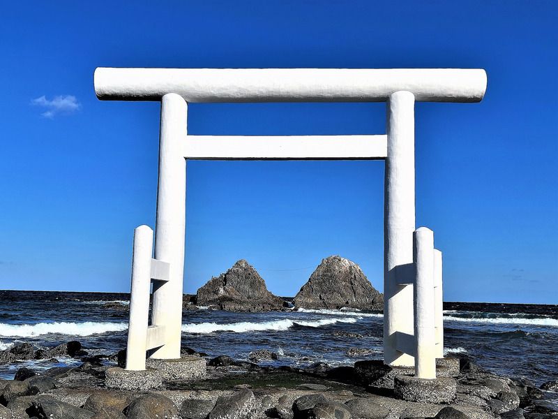 砂浜にある鳥居としめ縄で結ばれ夫婦のように並んでいる