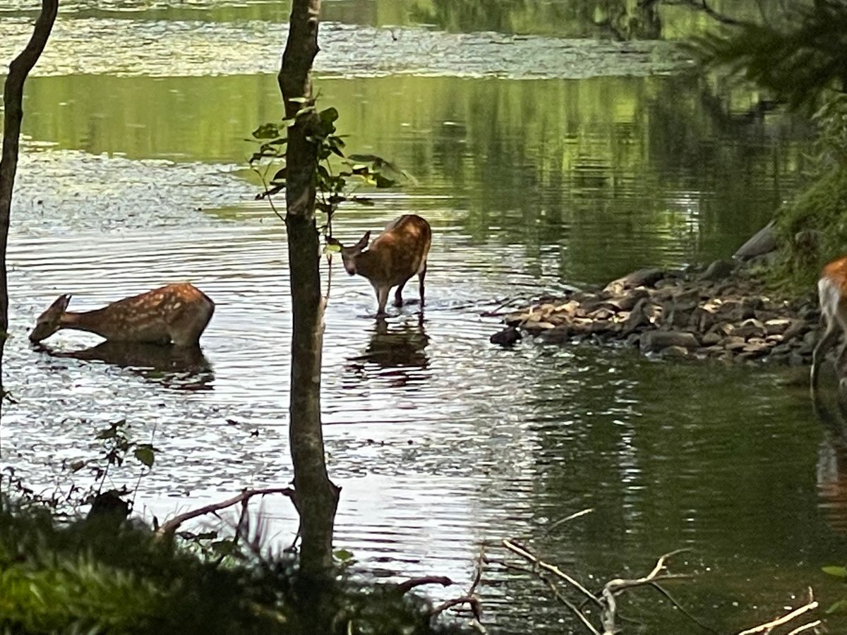 シカだけでなく、ヒグマに出会えたのは良いタイミングでしたね!水の中に佇むエゾシカの写真が涼し気で素敵ですね。