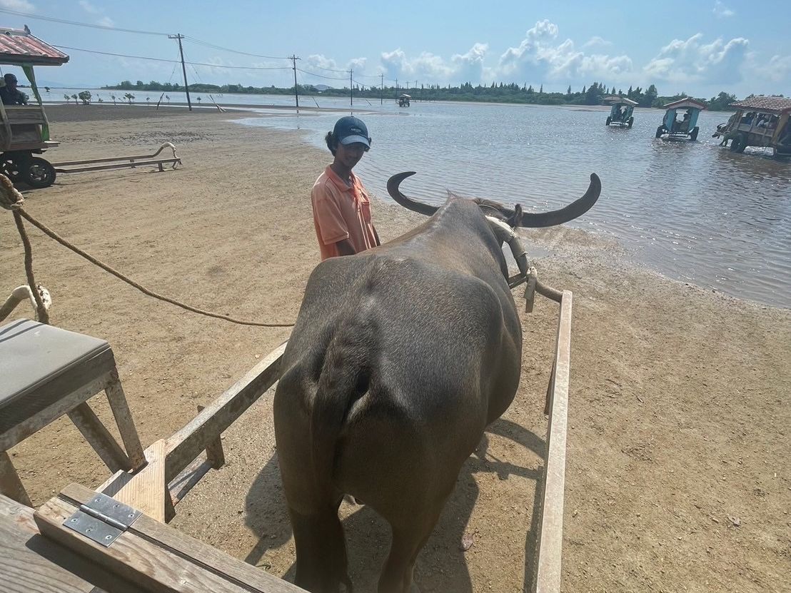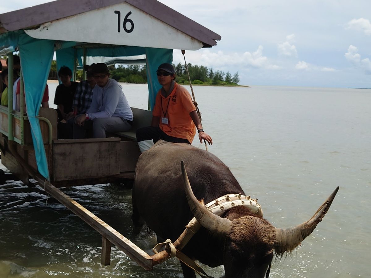 水牛を:間近で見るのも初めてで、立派な角に圧倒されながらゆらゆら揺られて海を渡る貴重な体験も楽しかったです。