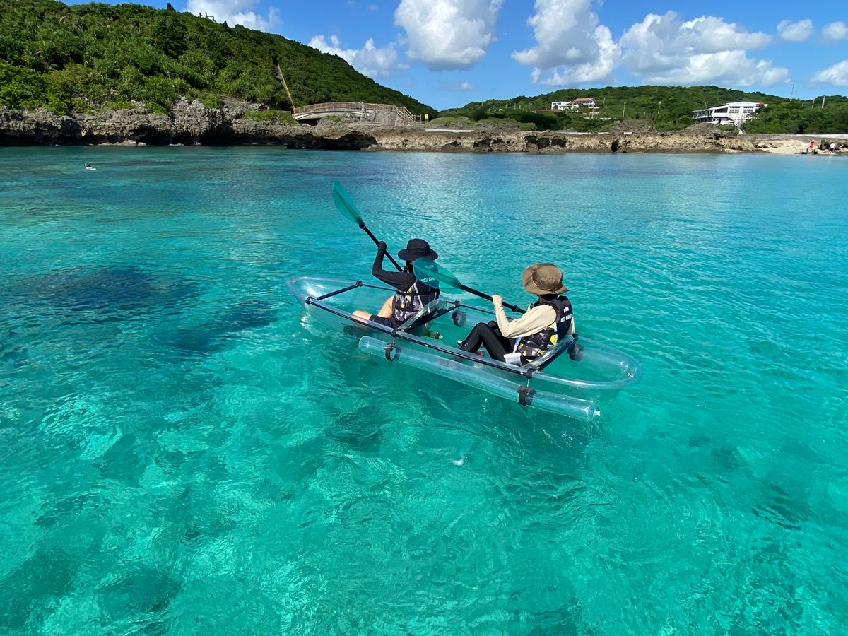 透けた底の下には珊瑚礁で、ゆったりカヤック体験。ドローンによる撮影動画と写真のサービスも。参加しなければ得られない体験が出来、大変満足できました。