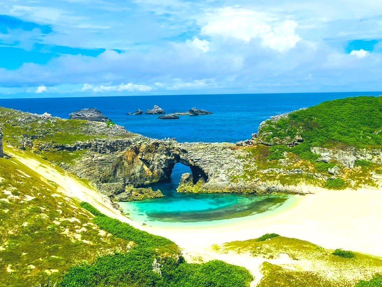 砂浜に残る、前夜に上陸したと思われるウミガメの足跡や産卵スポット、ヒロベソカタマイマイの半化石等たくさん見たあとは島の上部に登って扇池を見下ろす絶景を堪能しました!!めちゃくちゃ綺麗な青で、しかもまだ誰もいなくて、ナイスタイミングを本当にありがとうございました