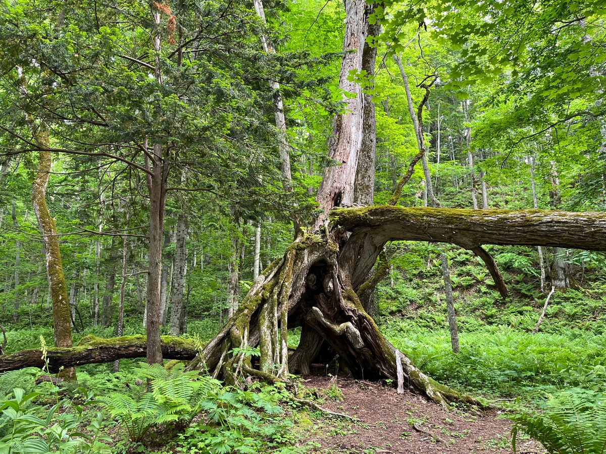 過去の台風等による倒木や地滑りがそのままになっており、同じ場所でも自然によって川の流れが変わったり景色が変化していく、というお話が印象的でした。