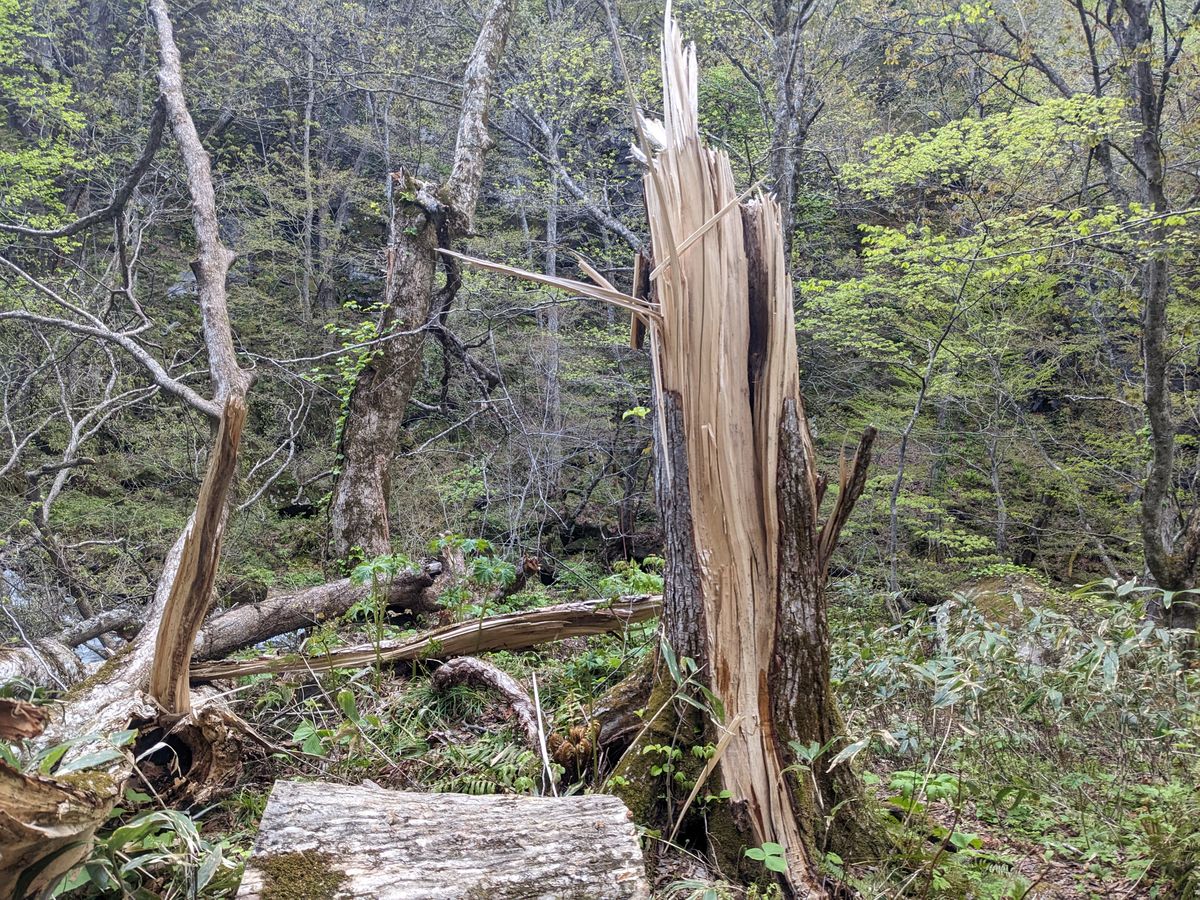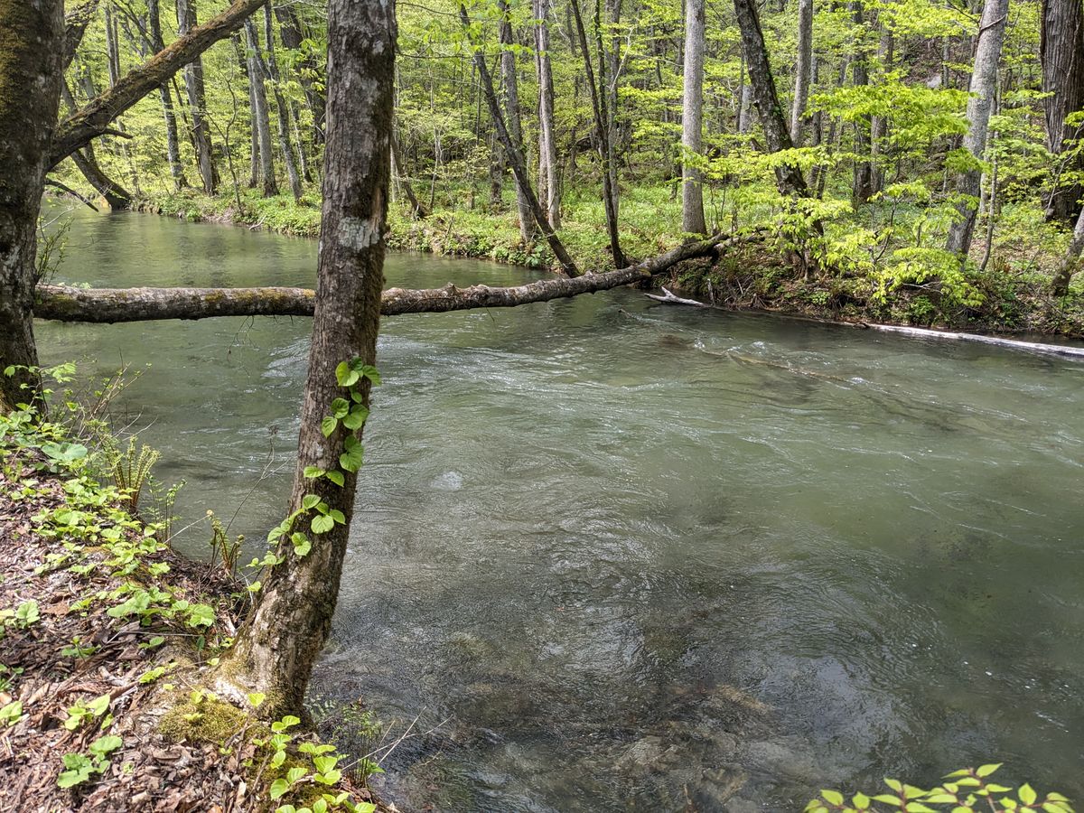 豪雨でなくても、雪の重みで倒れる木がたくさんあり、清流の流れをせき止め、あちらこちらに中洲ができ、そこに植物が育っているそうです。