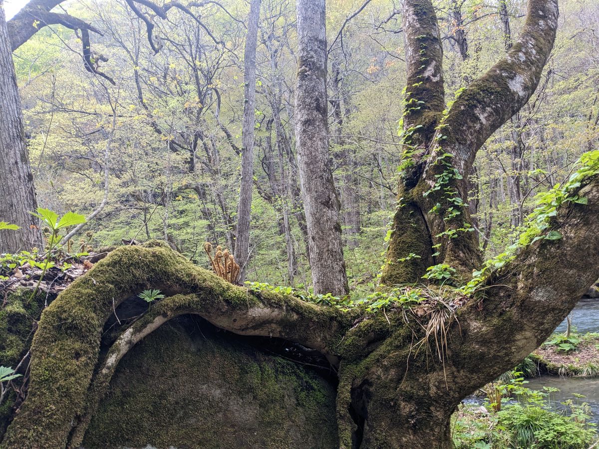 奥入瀬渓流ネイチャーツアーでは素晴らしいガイドさんに出会うことができました。渓谷内に生息する草木や野鳥の説明を詳しく教えてくれるとともに、昨年の豪雨被害で倒れた巨木が橋のように清流にかかり、小動物たちの通り道になっていることを教えてくれました。