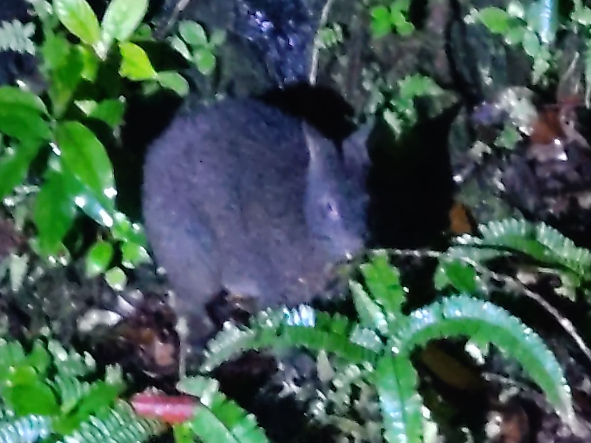 スコールのような雨が降ったあとにナイトツアーに!入ってすぐに黒うさぎに会ったよ。少し動いて頭を葉っぱに隠して隠れたつもりがお尻が丸見えで、