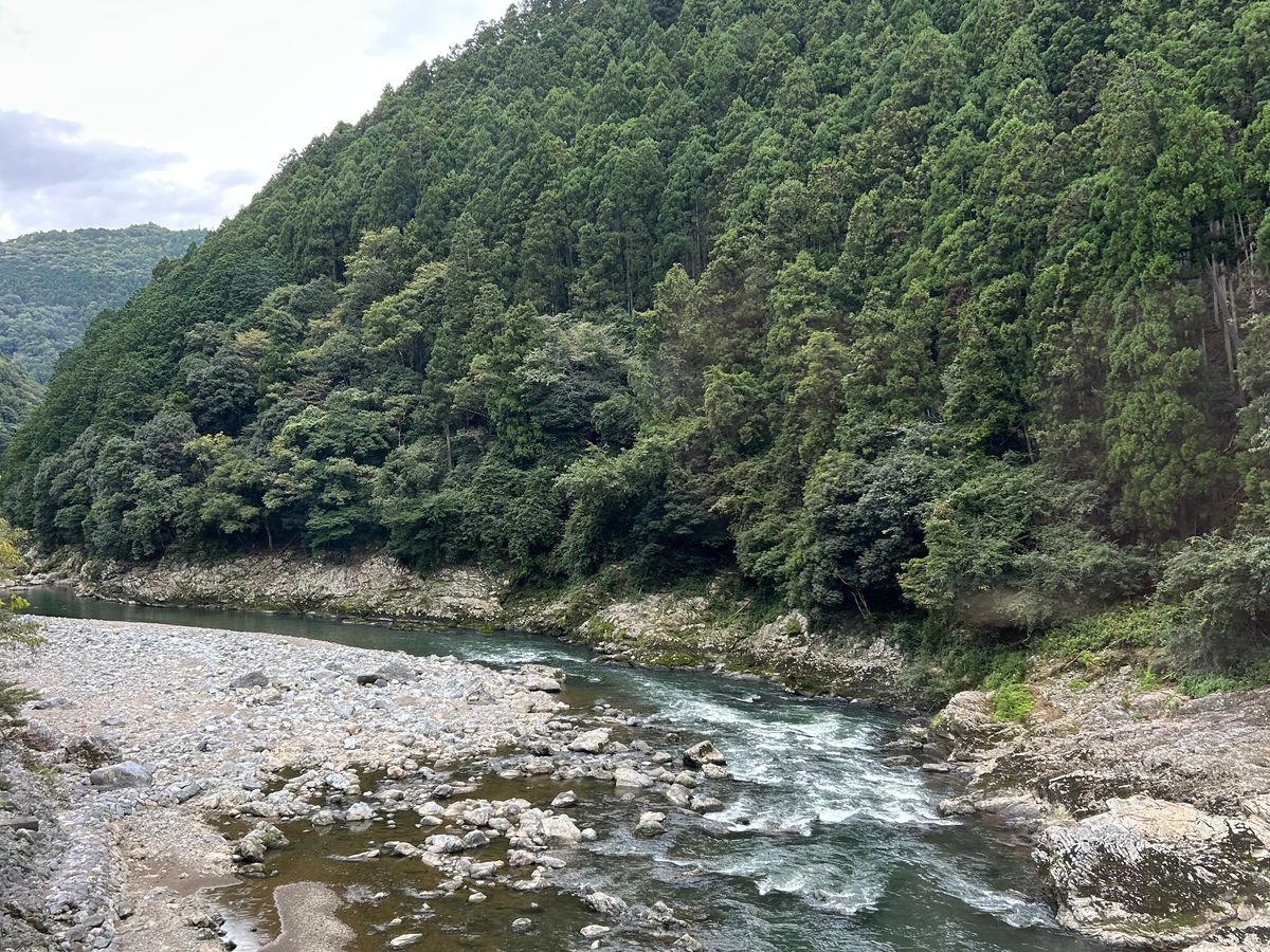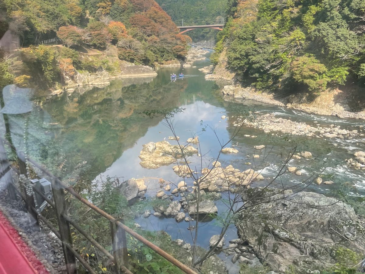 11月中旬の嵐山観光でトロッコ嵯峨駅から亀岡駅まで乗車。途中の景色は列車の両サイドから交互に見ることができた。途中保津川下りの船と出会うチャンスがあり手を振って挨拶するなどひとときの列車旅の思い出となった。