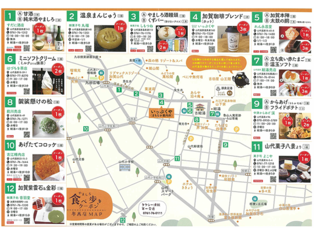山代温泉で一泊予定だったので、少し早く行って、山代温泉街散策、その際こちらのチケット購入利用。食べ歩きと行っても中で休憩できる施設さんもあり、5月のゴールデンウィーク明けに行ったので季候も良く、人でもそれほど多くなく、途中、古総湯や総湯も体験し、充実した半日を過ごすことが出来ました。ありがとうございました。