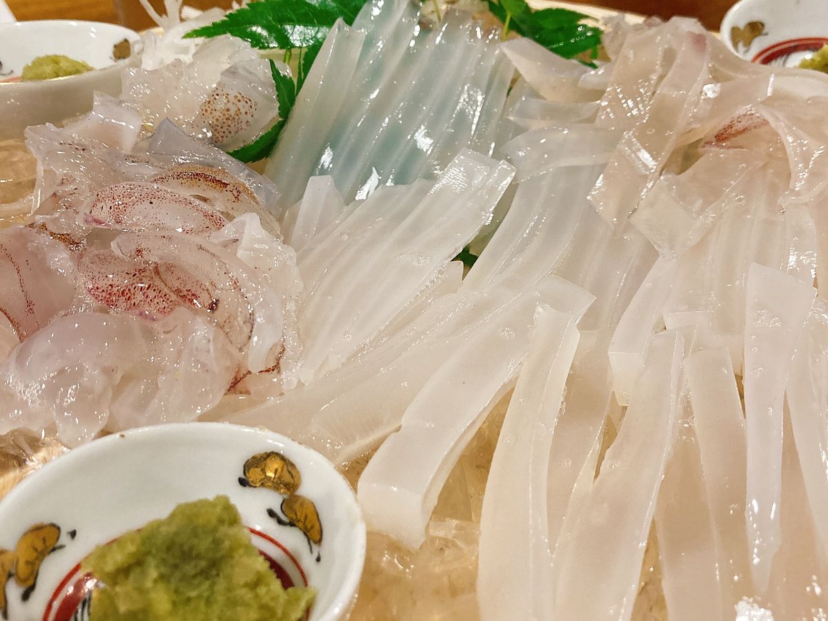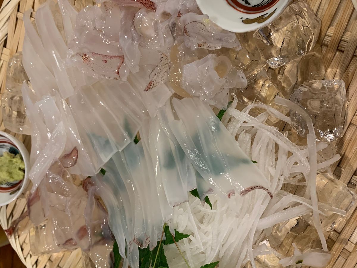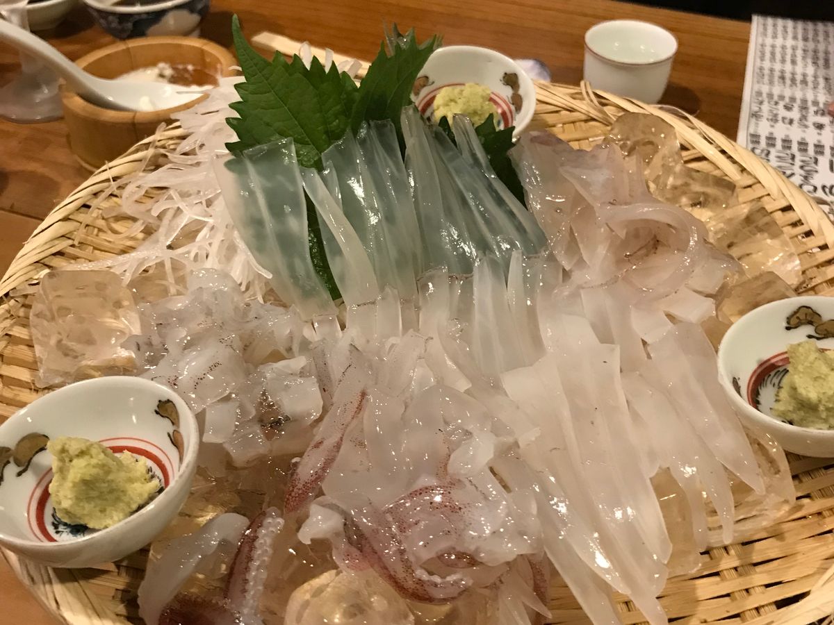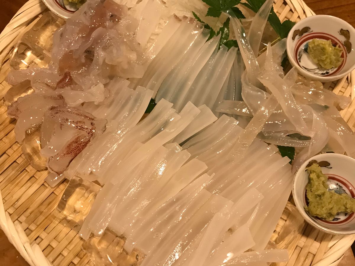 田吾作のイカ刺しのイカは漁船から連絡を受けて店の水槽付きトラックで運ぶそうで絶品。