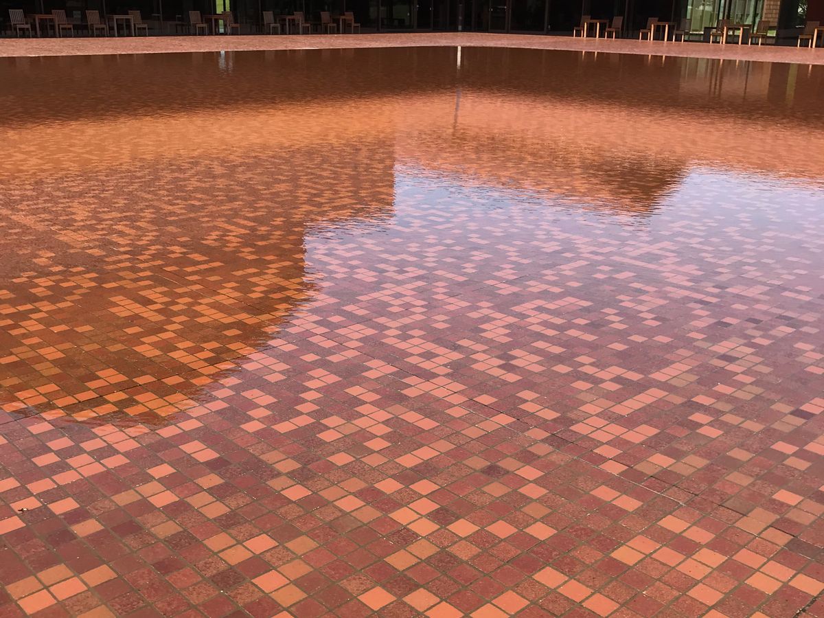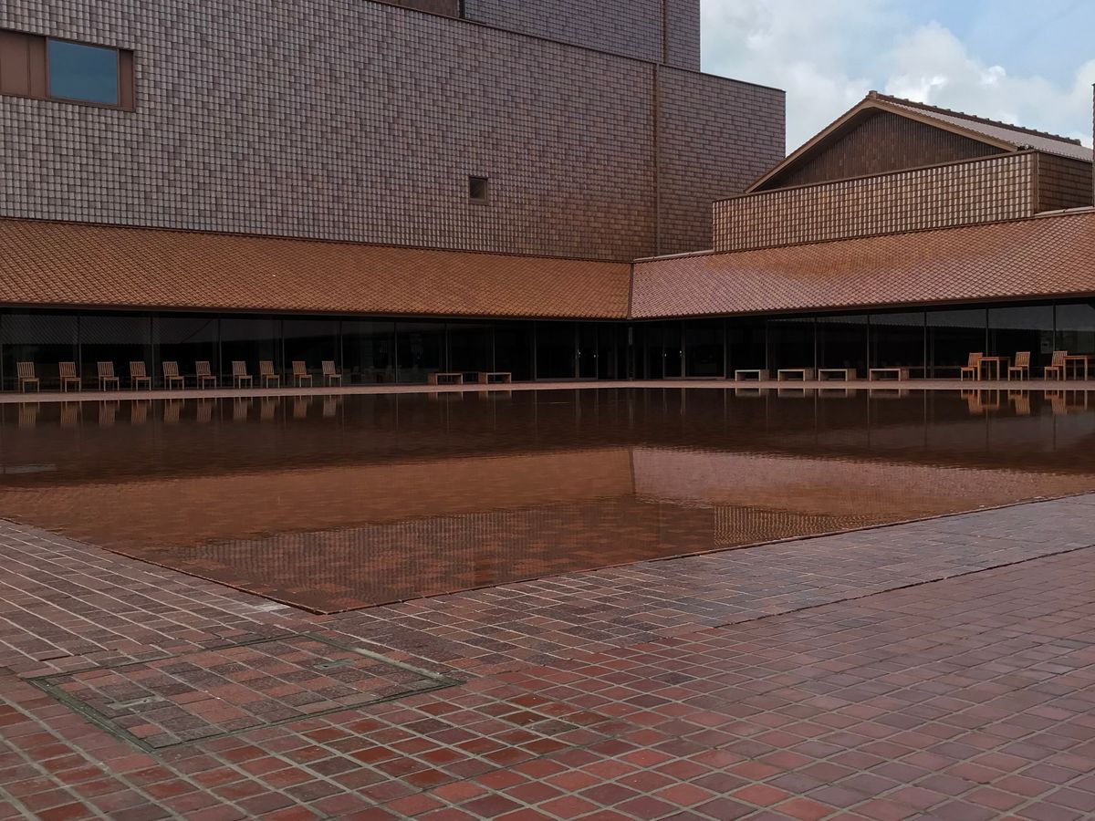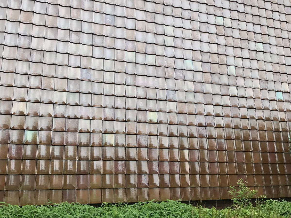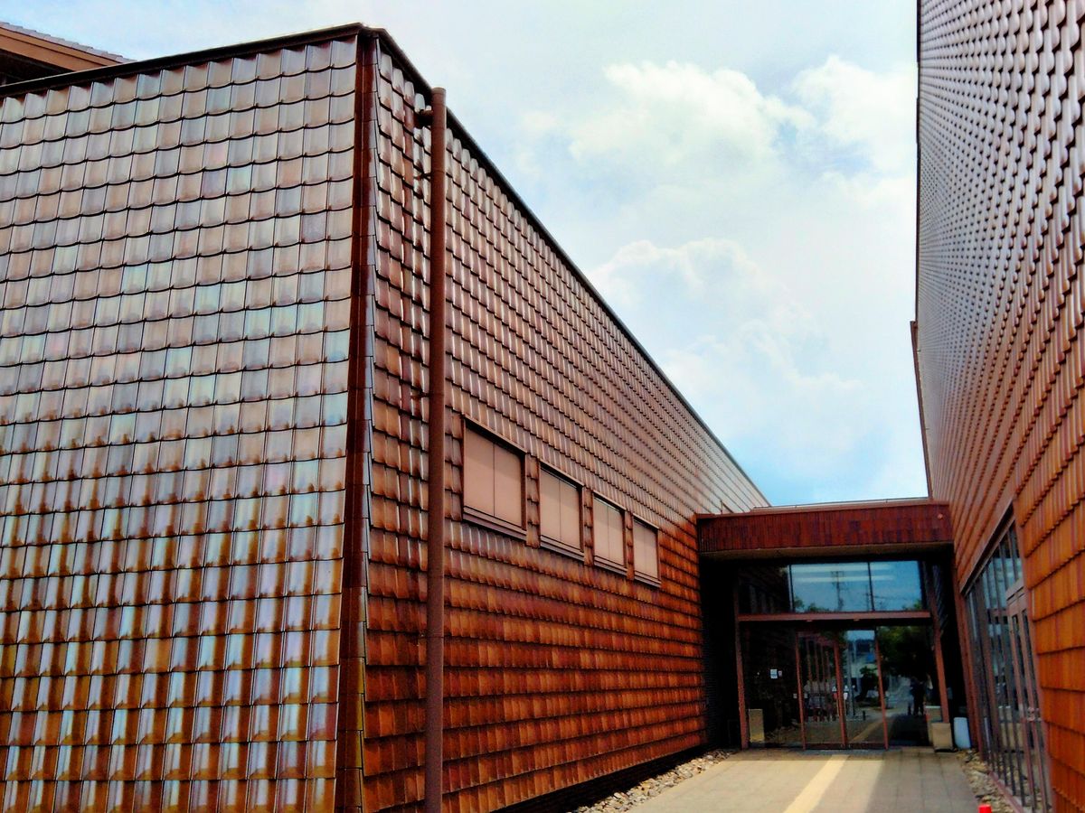 萩・石見空港でレンタカーを借りて、街まで10分ほど走る間に、段々その意味が分かってきます。住宅に使われている瓦が普通の赤い瓦ではなく、光を受けてキラキラと輝いていて、本当にキレイ。石州瓦というそうですが、益田やこの近隣の街ではよく使われている伝統的な瓦で、街並みにも統一感があってとても素敵でした。極めつけは28万枚の石州瓦が使用されたグラントワ。展示も素晴らしかったですが、外観や中庭も楽しめました。