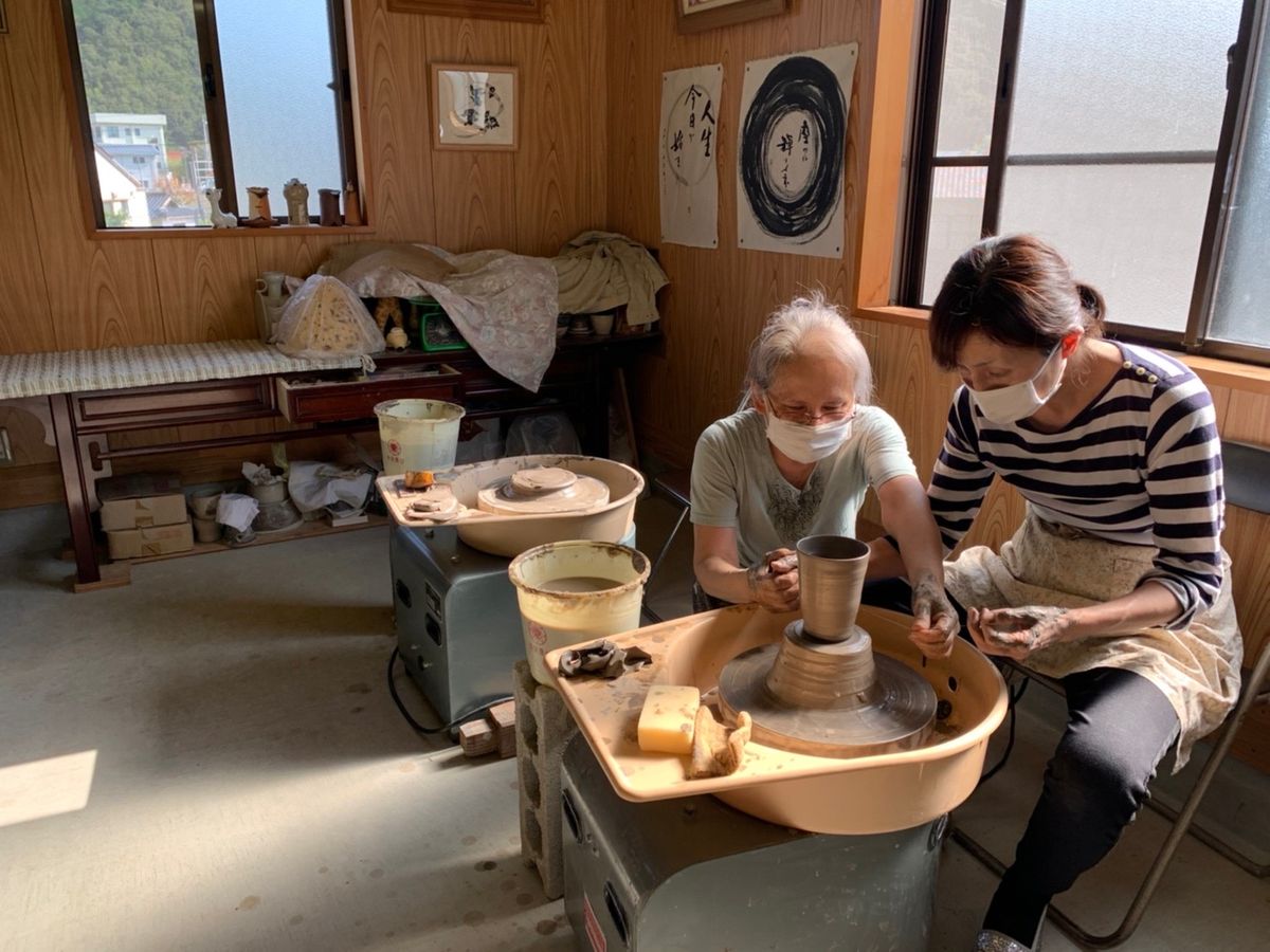 前回は見学だけだった雪舟焼きの窯元で、今回は陶芸を体験、師匠からは見事なデモを披露してもらい、奥様からは各々好きな抹茶碗でお茶を立てていただきました。