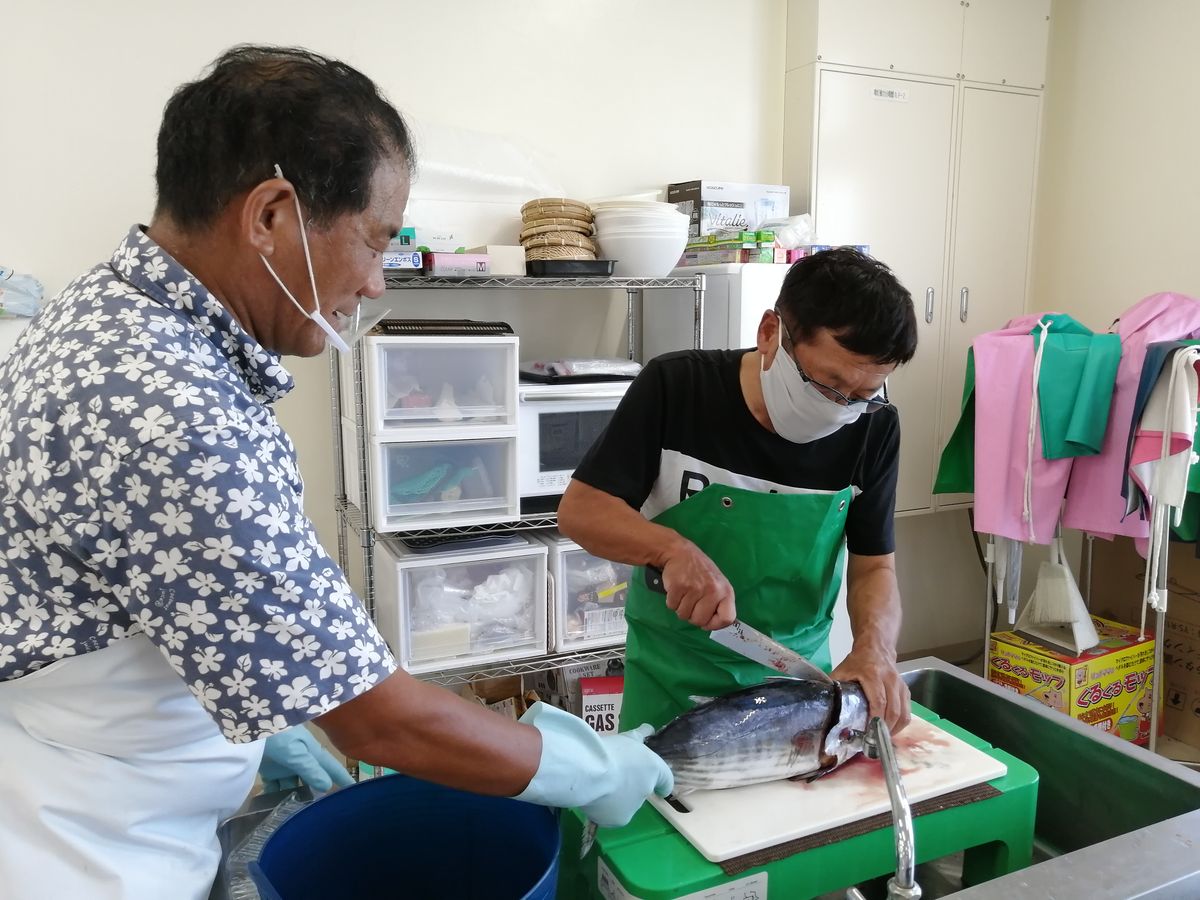 どんな魚を捌くのだろうと思っていたら、なんとマグロとカツオが出てきました!捌き方は地元の漁師さんが丁寧に教えてくれ、きれいに3枚におろすことができました。