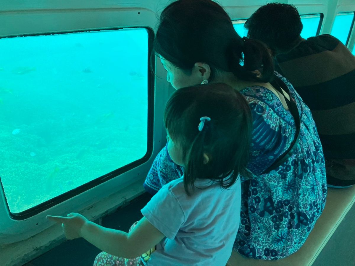 2歳の娘と乗りました。ポイントまで船が走り、そこで止まると船の底が下がる仕組みです。船の窓はピカピカで、シュノーケリングと同じくらいに水色の海できれいなお魚がたくさん見れました!娘もたくさんの色とりどりのお魚に大感動。