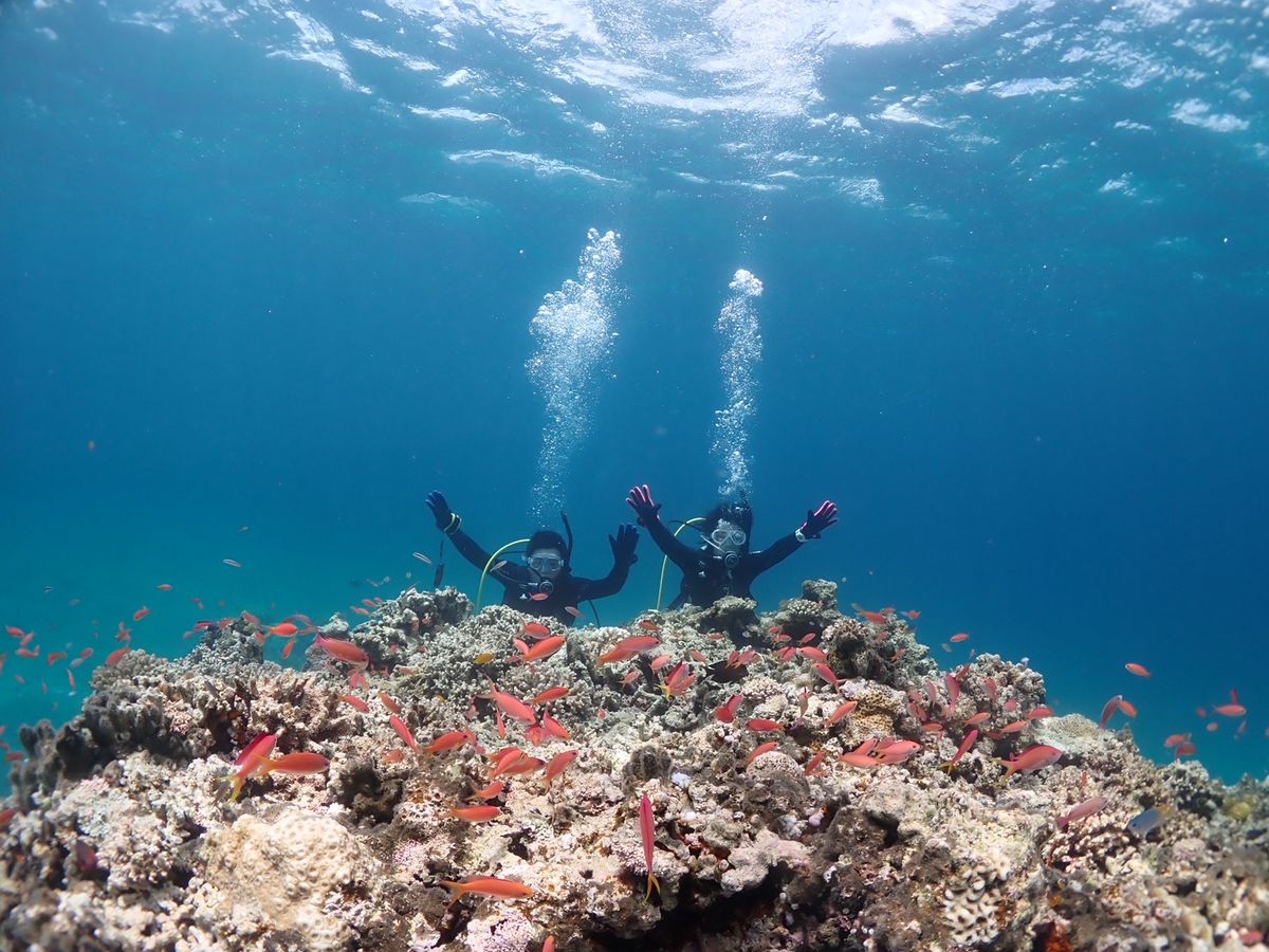 しかし、スタッフの方の明るい笑顔と丁寧な事前講習に加え、ダイビング開始後は、その都度、こちらの状況を丁寧に確認していただきながらリードしていただいたため、とても楽しい海中時間を過ごすことができ、サンゴ礁の上を泳ぐキンギョハナダイの群は、本当にキラキラ輝いていて大感激でした。