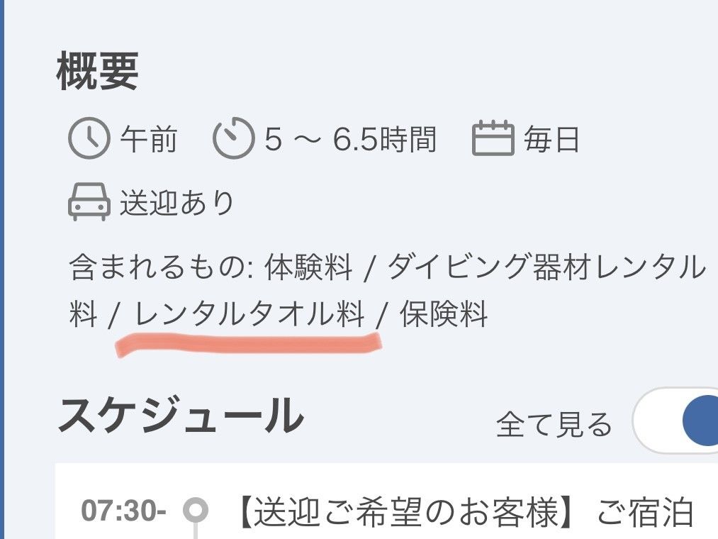 予約したサイトの方にはレンタルタオル有りと表記があり持ち物水着だけと書いてあったからタオル持たずに行ったら
