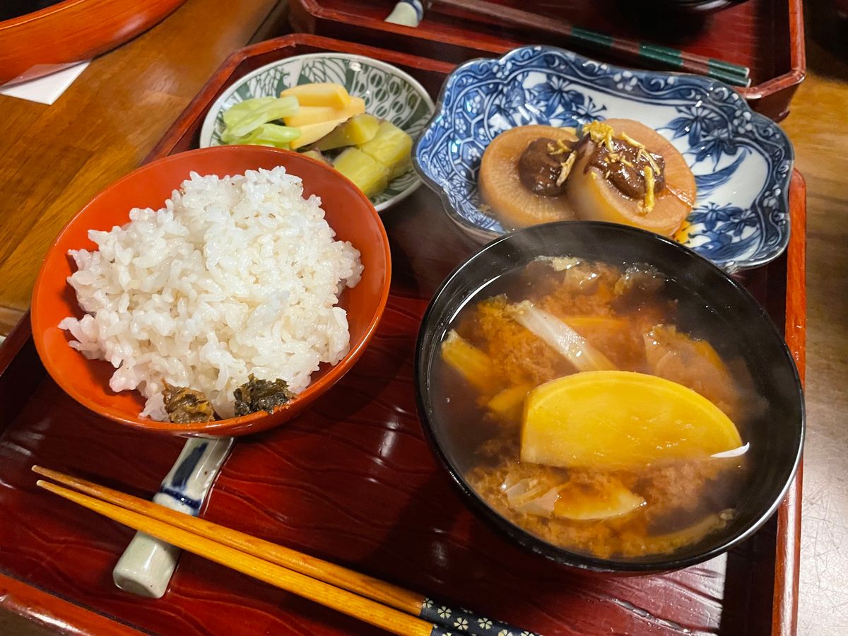 土鍋で炊かれたツヤツヤのご飯に季節のお野菜がふんだんに使われたお味噌汁が美味しくて何杯もおかわりしてしまいました。特にご飯に添えられる糠漬けとふきのとうの味噌が絶品でした!