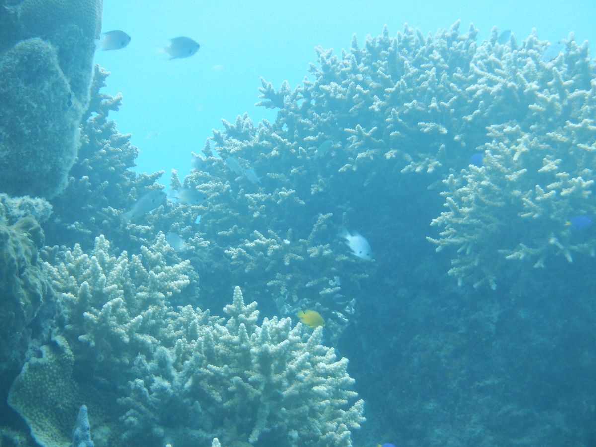 真下近くに珊瑚と珊瑚に生息するお魚がカヤックの底クリア部分からたくさん楽しめました。