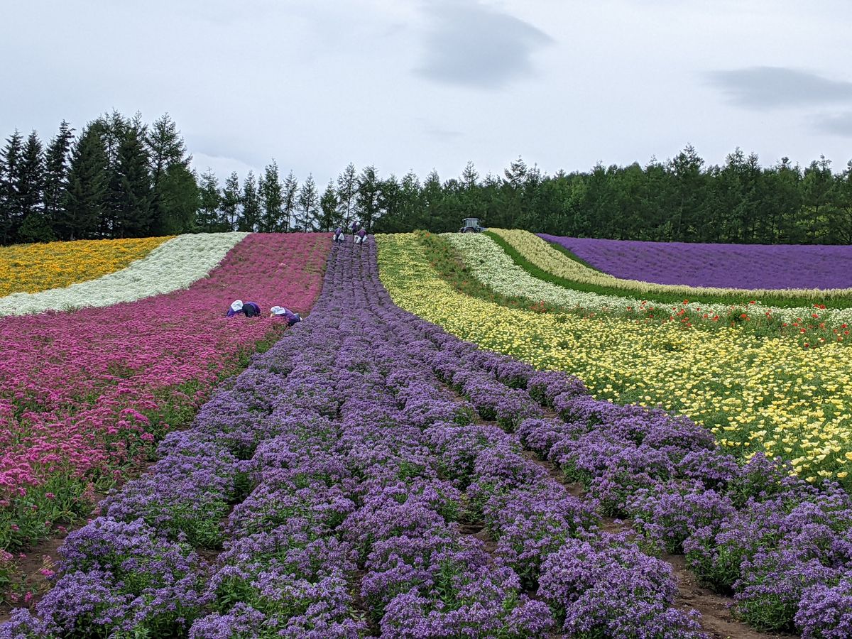 2022年 7月17日に富田ファームから順次周って行きました。天気予報は大分以前から雨予想でやはりその日も雨になる予報でした。最初に行く富田ファームでの90分は雨も降らず回り写真もいっぱい撮れてラベンダーアイス・メロンを食べ、時間がないのでメロンパンを購入してバスに戻る直前に頂きました。昼食の時間が無いのでその後雨が降ってきましたがちょうど車中からの見学が続き四季彩の丘ではトラクター500円でまわることが出来たので助かりました。やはり青い池は天気だともっと素敵かなと思います。バスの運行やガイドさんは感じ良かったです。