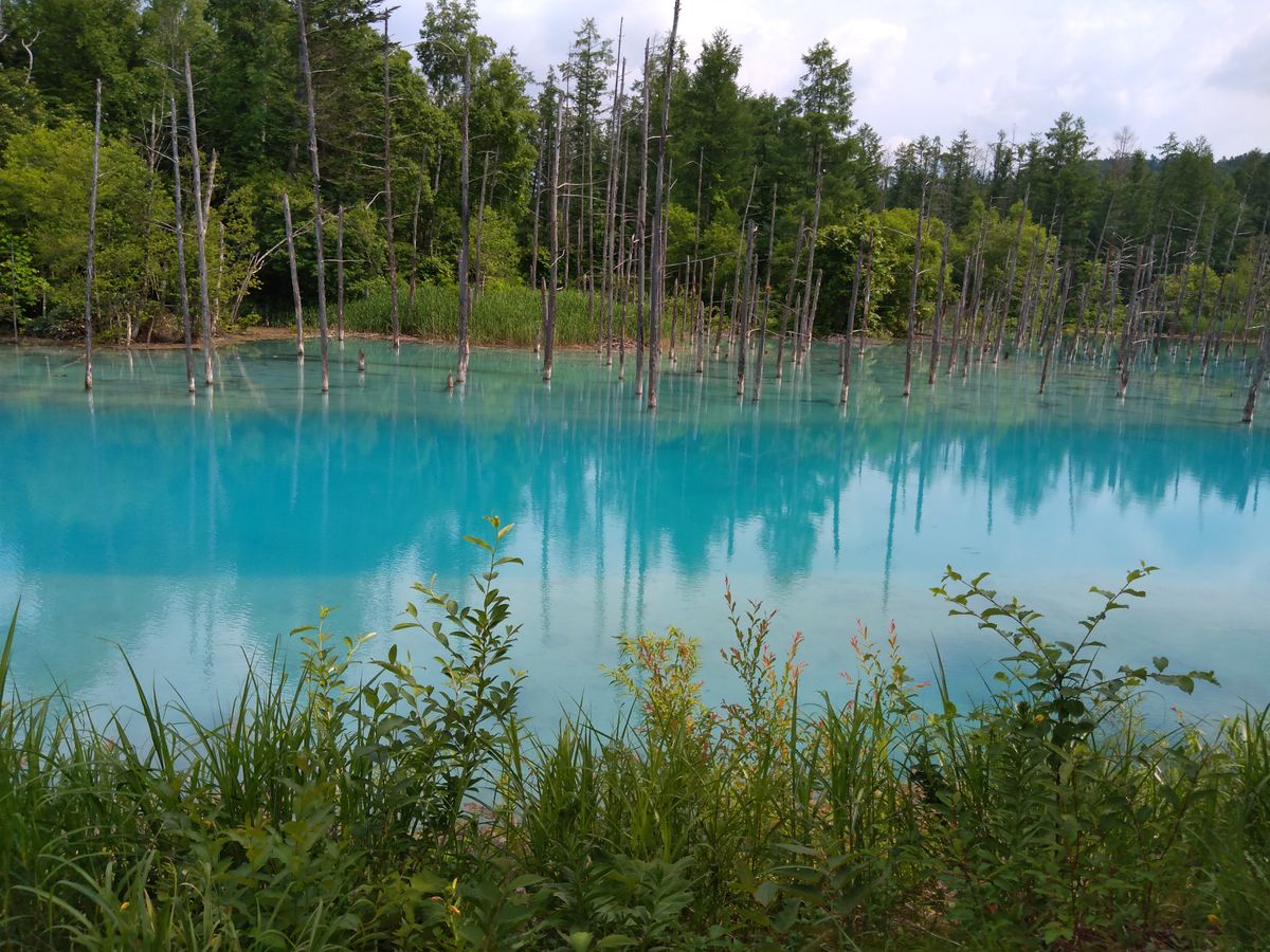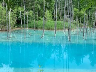 また、訪れてみたかった青い池も、水の青さに写真たくさんとりました。