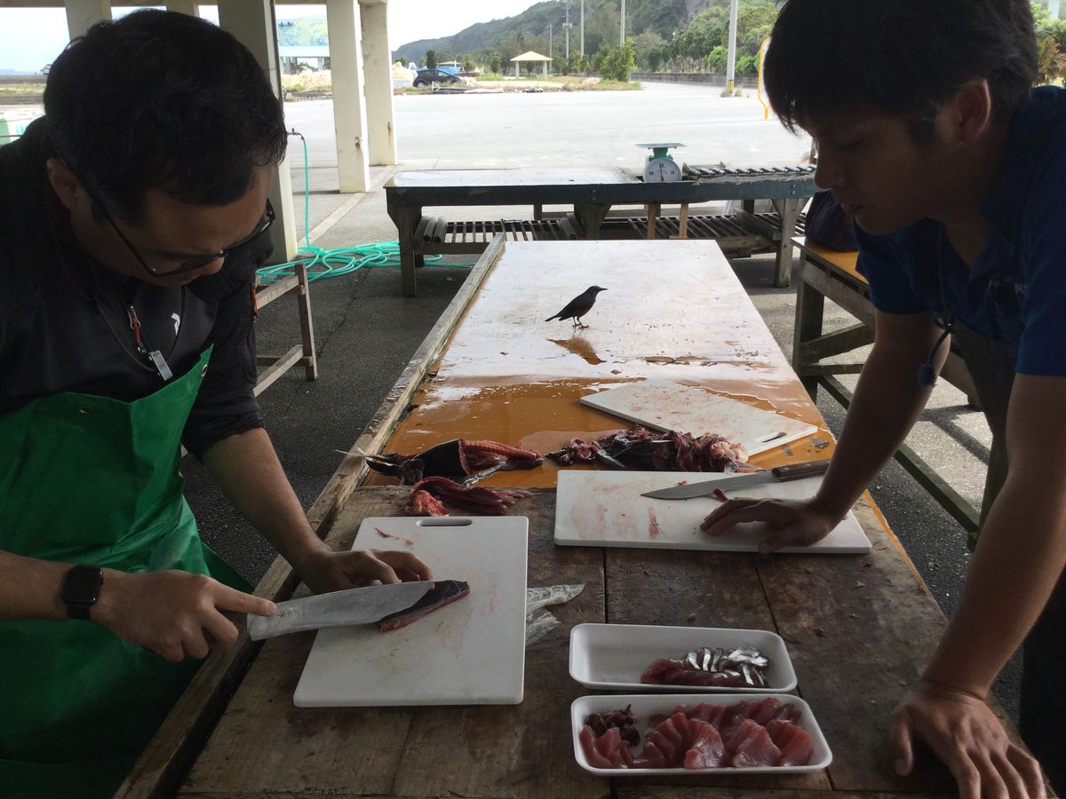 料理好きな夫と参加、2人で1匹さばきます。先生がお手本でもう1匹さばくので、お刺身と魚の天ぷらは2匹分 結構な量で、天ぷらはお持ち帰りできます。夫は魚をさばくのは慣れていますが、今回のさばき方はまな板がなくても、狭いスペースでもさばけると感心していました。きっと佐良浜の漁師さんが船上でやっていた方法なんでしょうね。一人で一気通貫で習った方がいいと思うので、今回はすべて夫がさばきました。