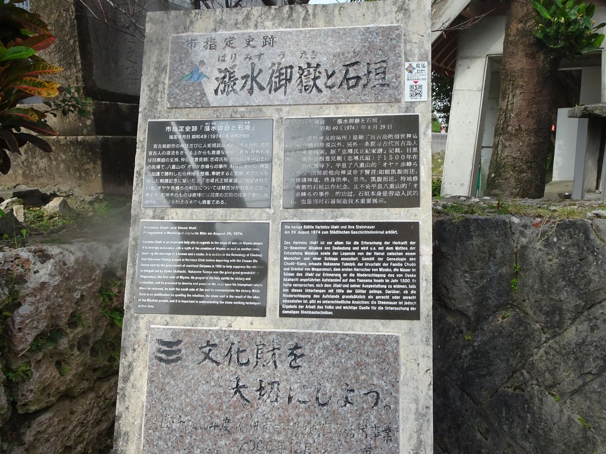印象的な輪郭線で描かれた宮古島の英雄たちの紙芝居の説明を聞きながら、宮古神社、漲水御嶽、歴代の豊見親のお墓などを案内して頂きました。普通に歩いていては見過ごしてしまいそうな植物の話や、葉の間に落ちている巻き貝はカタツムリのように木に登るものなのだなど、いろいろな質問にも答えて下さったガイドさんの解説は、大変楽しく、あっという間の90分でした。最後に解散場所近くのスーパーと鮮魚屋さんを教えてもらって、平良ならではの食べ物でランチをすることもできました。宮古島を知るためには、是非、まずこのツアーに参加することをおすすめします。