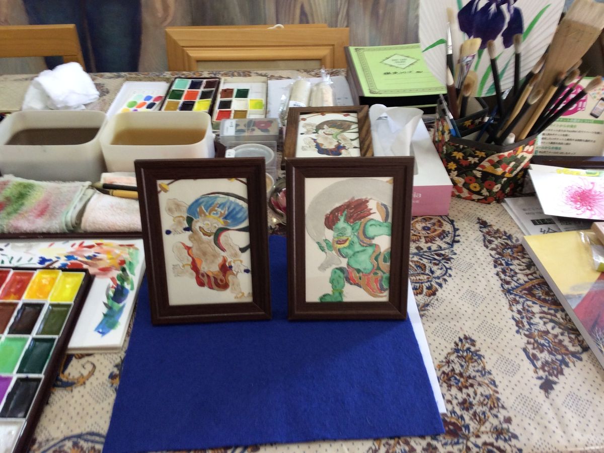 まず、前日にメールで丁寧なご案内をいただき、助かりました。駅からどのバスに乗るというだけでなく、バス停を降りたらどうすればよいかも書いていただき、もちろんグーグルマップでは事前に調べてあったが、でもとてもわかりやすくてよかったです。初めに下絵が書いてあるハガキを選び、その上に絵の具を塗ります。下絵は、風神雷神以外にも動物や花もありましたが、友人と私でやはり風神雷神の部分を選びました。もちろん着色のモデルはありますが、独自で選べますし、またアドバイスもいただけるので、下手さに自信はあっても、それなりに仕上がったと思います。始める前はハガキ大の大きさなので、すぐに終わるかと思いましたが、やはり絵の具が乾くのを待って、またどんな色にするか考えるのは意外に楽しかったです。途中で、紅茶も出していただきました。気が付くと、2時間が過ぎていました。終わりにはその絵を額に入れていただき、終了でした。京都にはもちろん観光がメインで行きますが、歳とともに、一日観光はしんどくなってきましたので、このような体験を一つ入れ、その後2~3か所廻るというパターンがこれからのパターンになりそうです。歳とった脳にもいい刺激にもなりました。