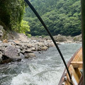 トロッコ電車からの車窓は緑が美しく、保津川下りは船頭さんの話が楽しく、また水がダイナミックに舟に入り込みエキサイティングでした。