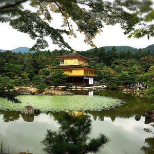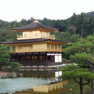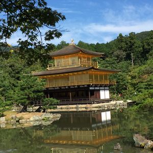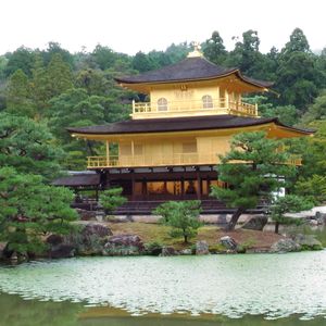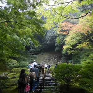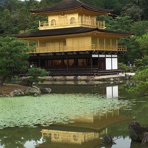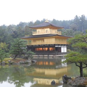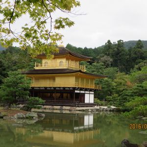 あいにくの雨で一時はどしゃ降りの観光となりましたが、寺までの散策の時には雨もやみ、しっとりと雨に洗われた緑がとても美しかったです。まだほんの一部ですが紅葉も始まっていました。金閣寺の金色も豊富な水辺に映り感慨深い光景でした。