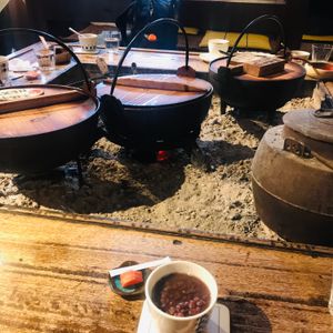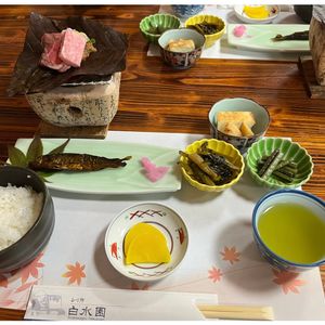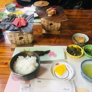現地に着くとすぐお昼ごはん(笑)そのことを知ってたので朝は少なめにしていたので、11時過ぎの昼食でも問題ありませんでした。内容は魚の甘露煮・野沢菜漬け・お蕎麦・飛騨牛等でご飯はおかわり無料!味が濃いめなので日本人は、老若男女関係なくおかわりしていましたー。