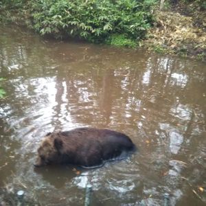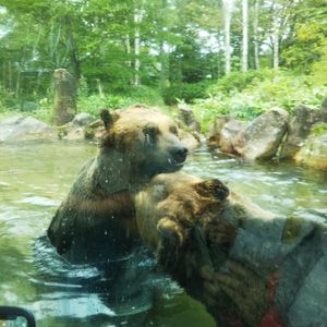 ベアウォッチングバスに乗り、園内にいる熊たちを見学します。バスの運転手兼ガイドさんが親切・丁寧に説明してくれました。全部で13匹いるそうでオスの熊、うち5匹は体調が良くないとのことで、8匹が放し飼いになれていました。熊はとても暑がりだそうで、大体、水のなかにいました。おもしろかったのは、ドッグフードが餌で熊さんたちはおいしそうに食べていました。バスを下車したところにある展望台のところに2匹いてとても活発な姿を見ることができました。施設での所要時間は1時間くらい見ておけばいいと思います。
