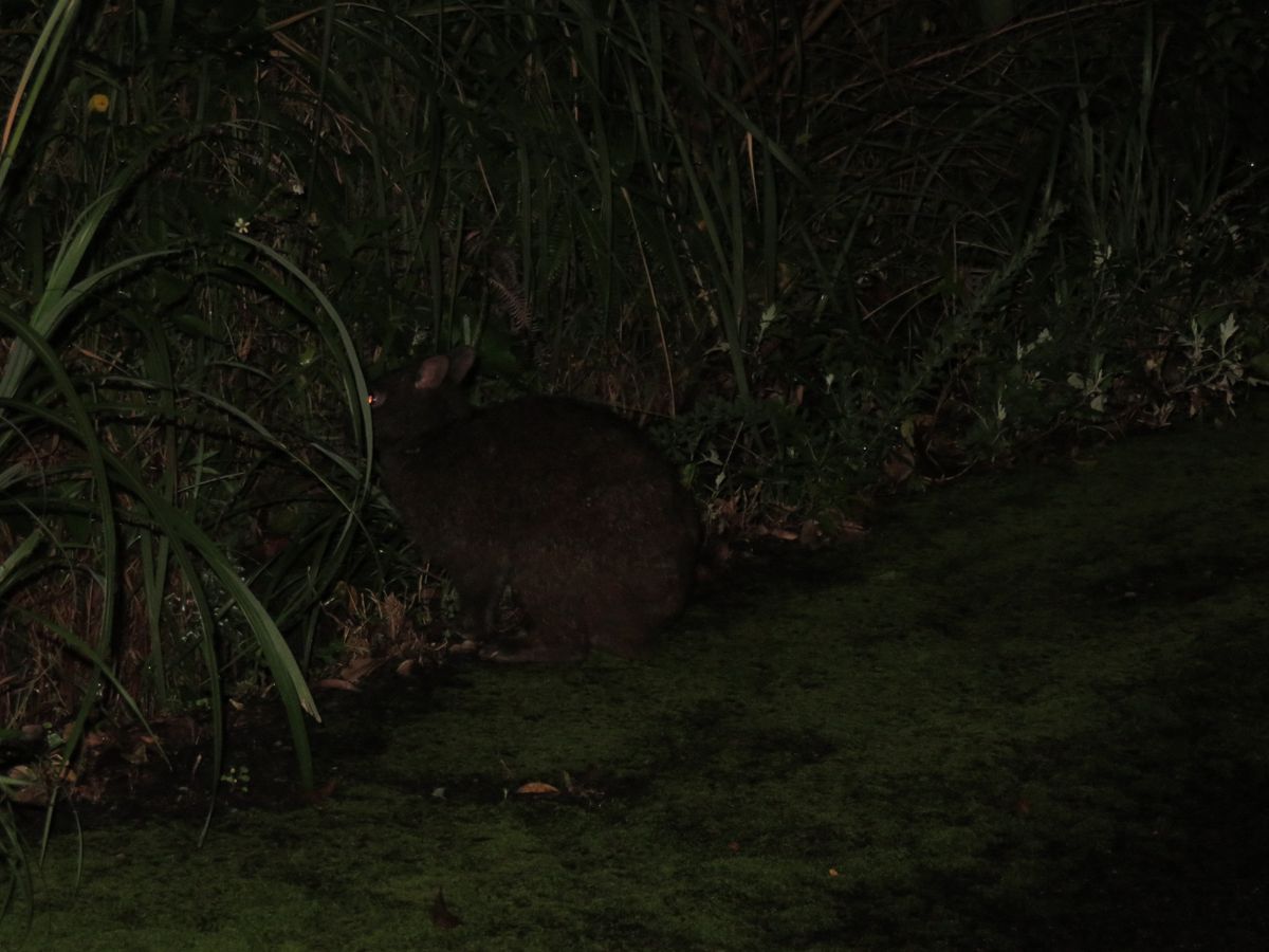 大変寒くて雨がかなり降る夜だったので、クロウサギを見ることを半ば諦めていましたが、ガイドさんの熱心な捜索のおかげで、雨の合間にはっきりと3羽のかわいいクロウサギを目にすることができました。一瞬のウサギの気配も含めれは5羽を観ることができました。