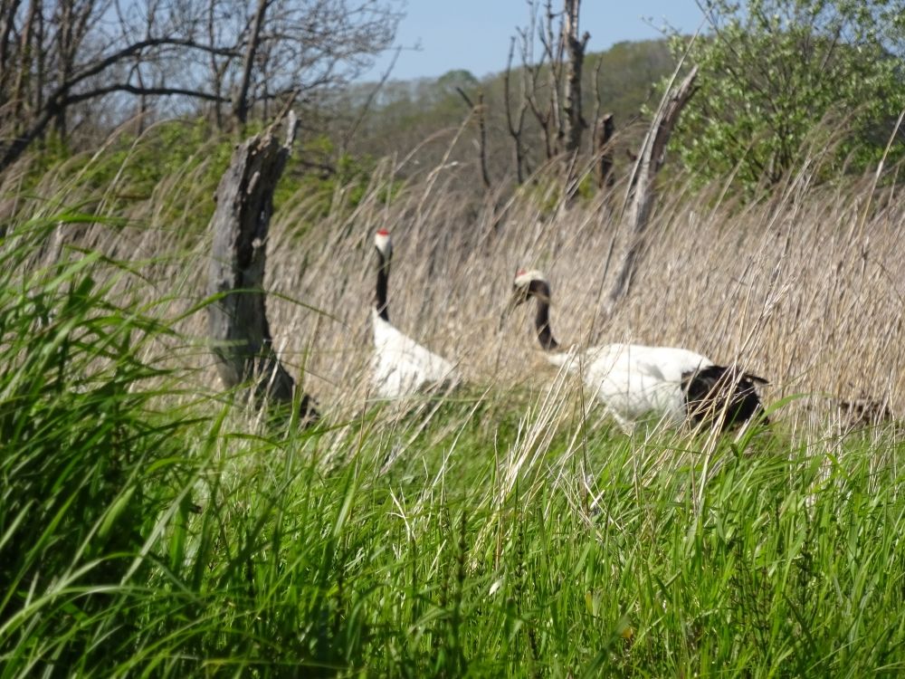 タンチョウのヒナの姿は伸びてきた草に隠れて見えませんでしたが、
