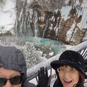その後、雪で真っ白な青い池をみたり、雄大な滝をみたり、満足でしたよ