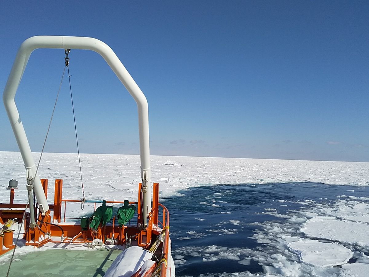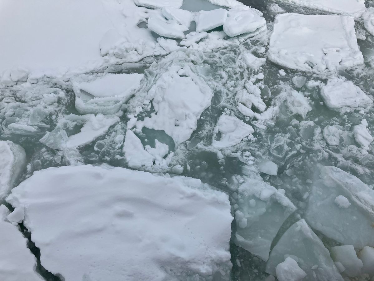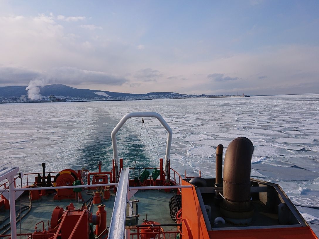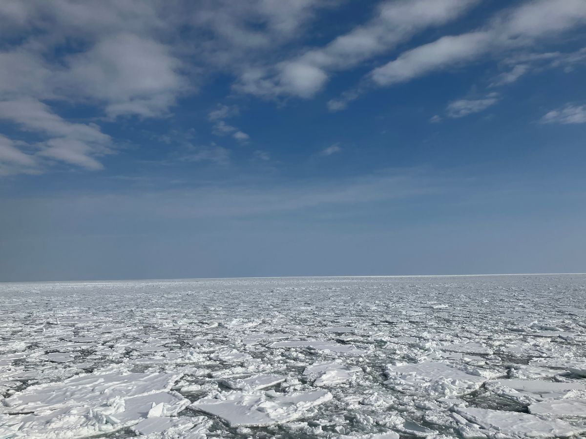 流氷は風向きなどにも影響を受けるので、見れるかどうかは運のような面もあるのですが、私が行った日は海一面が氷に覆われ壮大な風景を楽しむことができました。氷の厚さは人が乗れるほど分厚いものではありませんが、船が氷を押しのけて進む様子は大変迫力がありました。