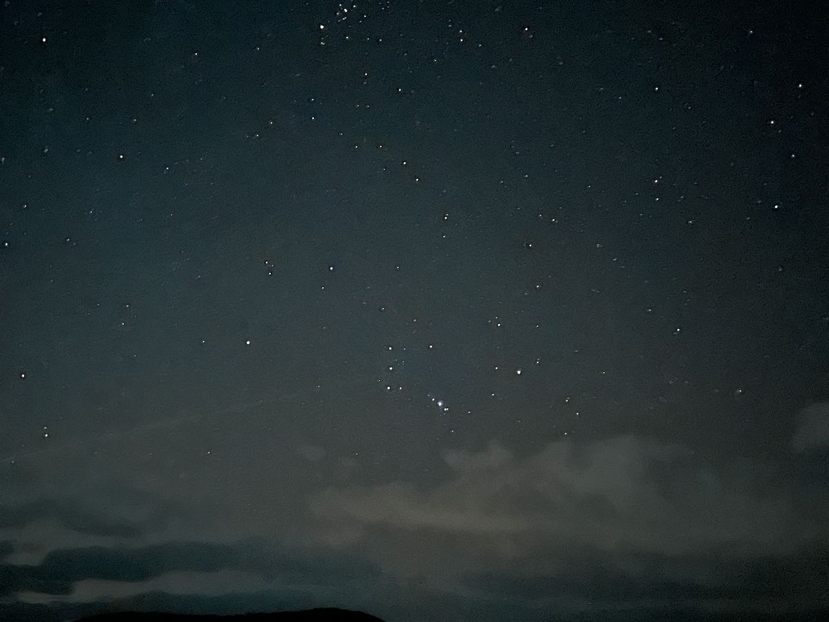 当日夕方の天気予報は「曇り雨」であまり良くない状況でした。ガイドさんがパソコンで雨雲レーダーで雲の状況を逐次を確認し、22時頃オリオン座をバックに撮影できるポイントに連れて行ってもらいました。到着した時はまだ三ツ星が微かに見える程度でしたが15分もすればバッチリ晴れてきて大満足な写真が取れました。人と星空をバックに綺麗に撮影できる古典的な方法には驚きました。