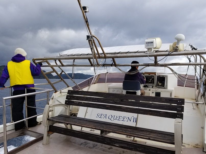 ライフジャケットを着用し、予定どおり出航しました。現場に着くまでの事前説明なども丁寧でした。船は大型船だったので隣人とも適当な距離を保って座ることができ、揺れも少なかったように感じました。