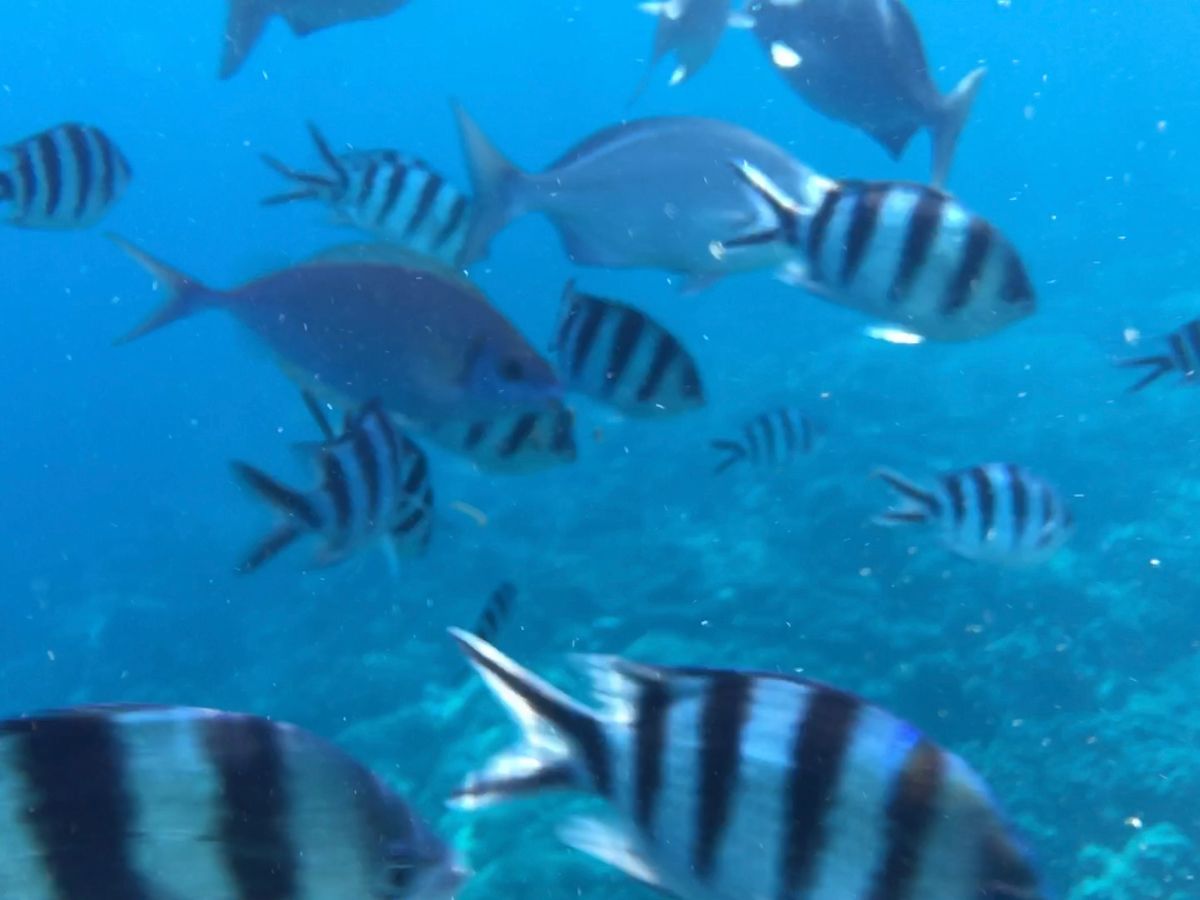 兄島付近でのシュノーケリングは、寒さを忘れるほど綺麗な海とたくさんの魚たちに感激。たっぷり泳いで大満足。