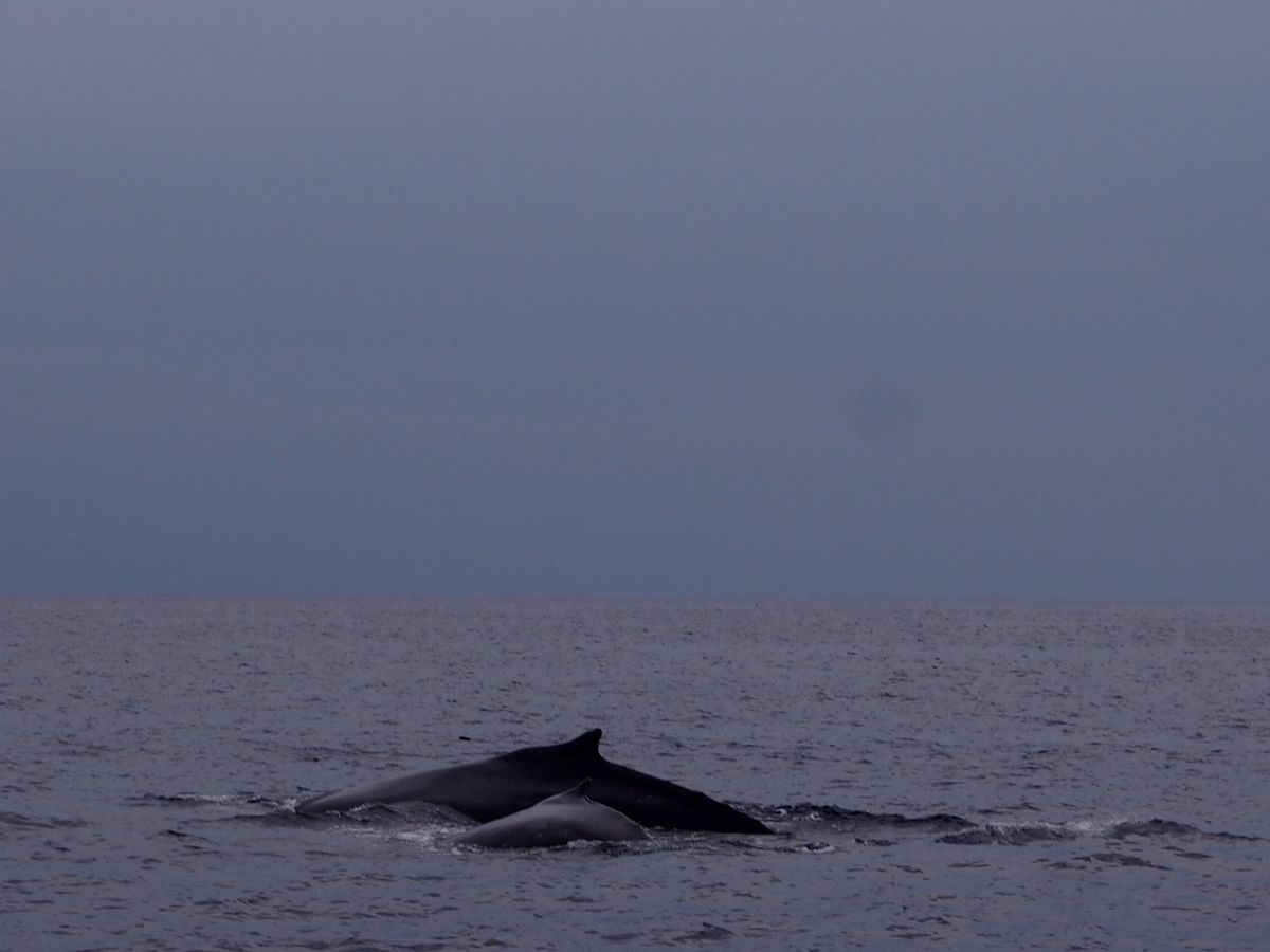 わたしたちは運が良かったようで、出航してから15分ほどで最初の潮吹きを目撃することができました。居たのは、親子クジラとオスのクジラの計3頭でした。