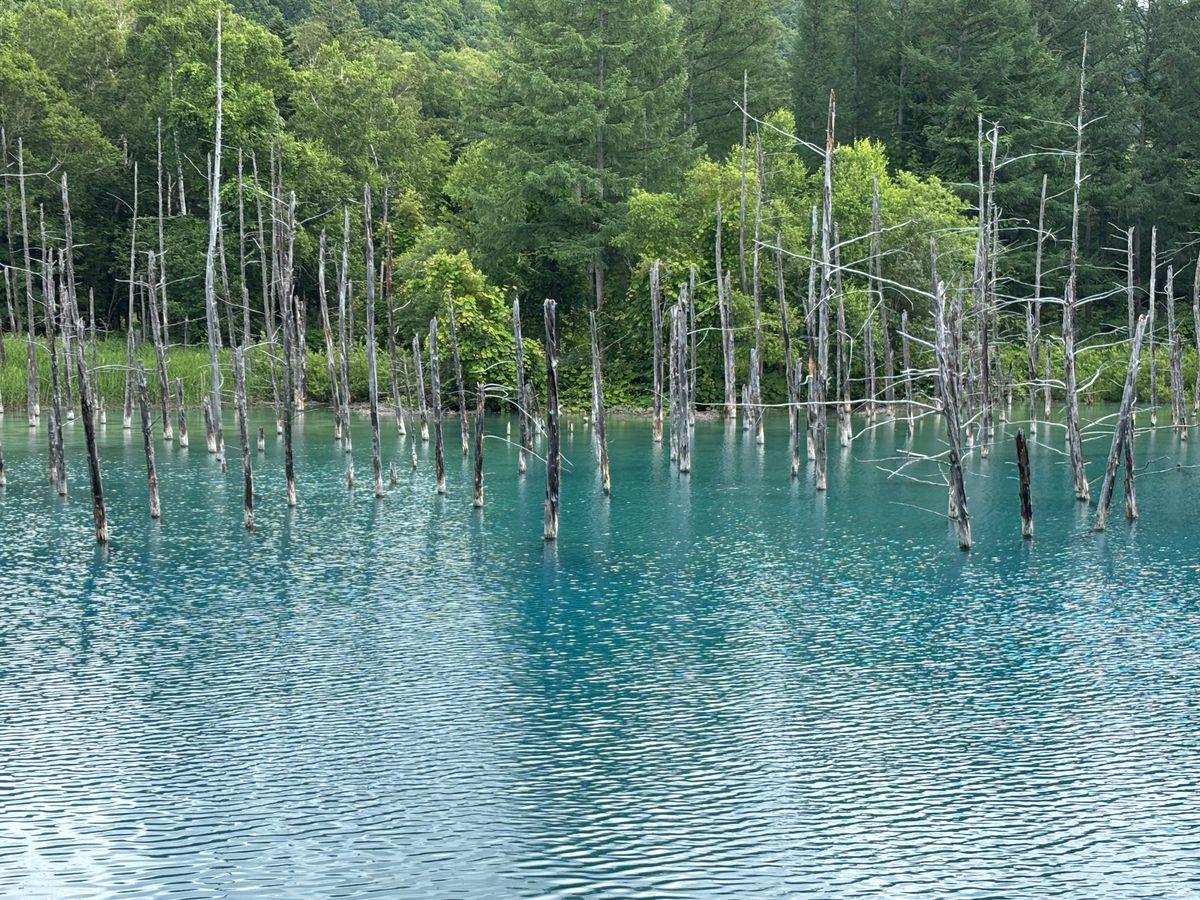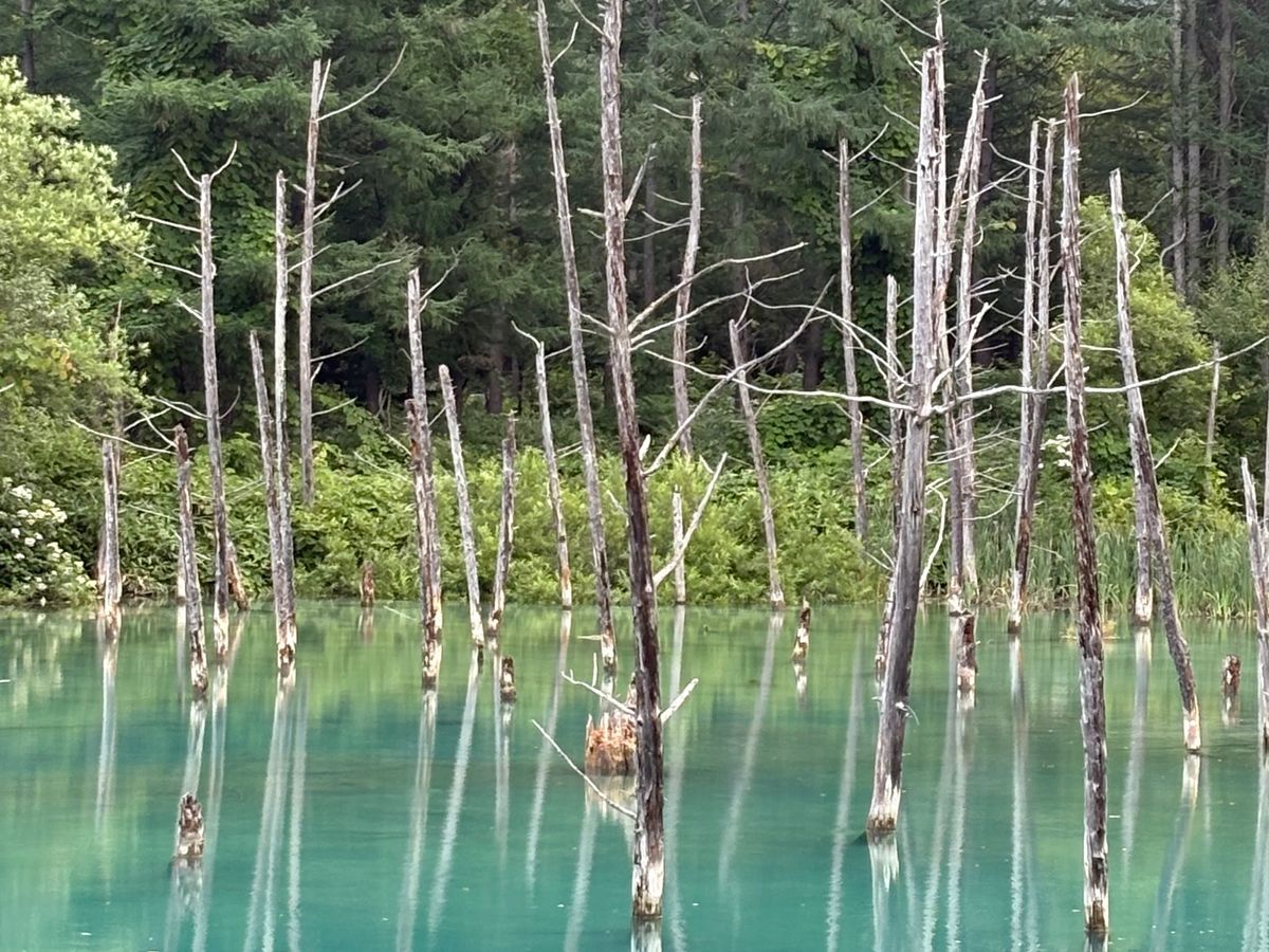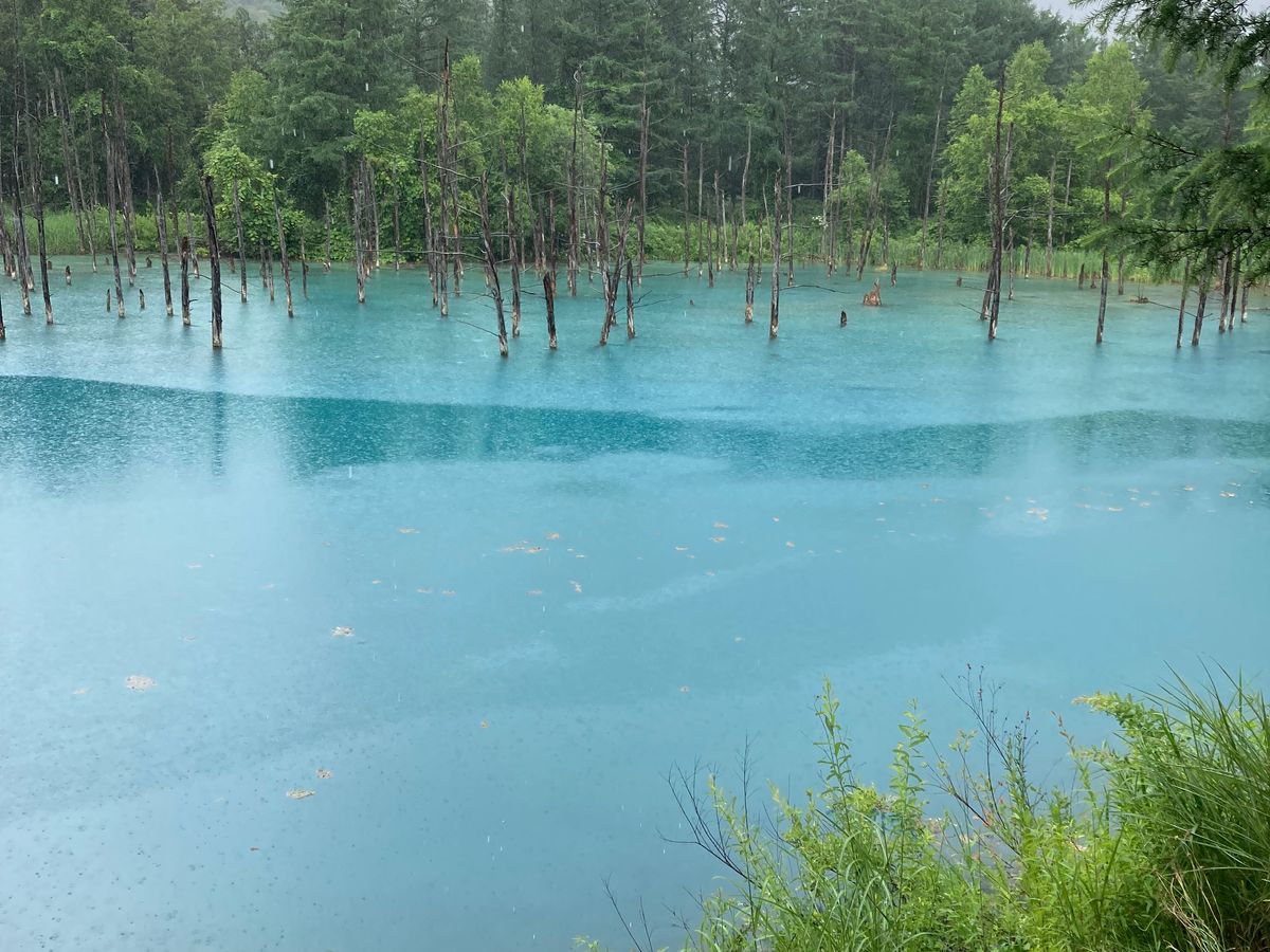 青い池は、雨のせいか水色っぽく見えましたが、それもまた幻想的でした。