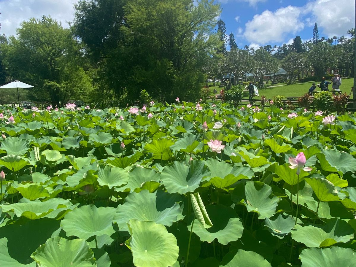 広い池に一面の蓮の花が、涼しげできれいでした。園内も花でいっぱいできれいでしたが、やっぱり暑い。