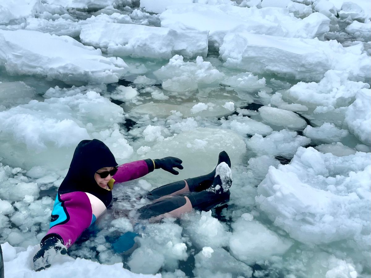荷物は靴も含めてガイド車両に置いて、道路脇でドライスーツに着替えます。海岸へ向かい歩いているといつの間にか海の上!流氷は写真で見られても、海氷線の壮大さや波で流氷が上下にフワフワ動いている様子など、現地でしか体験できないものがあります。流氷が来る来ないや天気は運次第ですが、ぜひ体験して見てほしいと思います