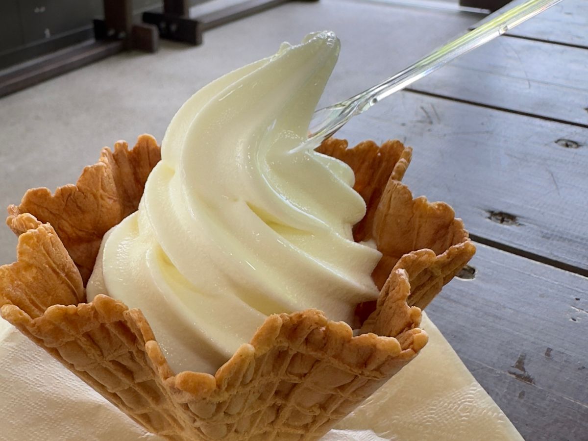 そのあとは展望台を目指し、飛騨牛ソフトクリームを食べながら歩きました。合掌造りのクッキーが乗っていて、景色と撮ると写真映えします。