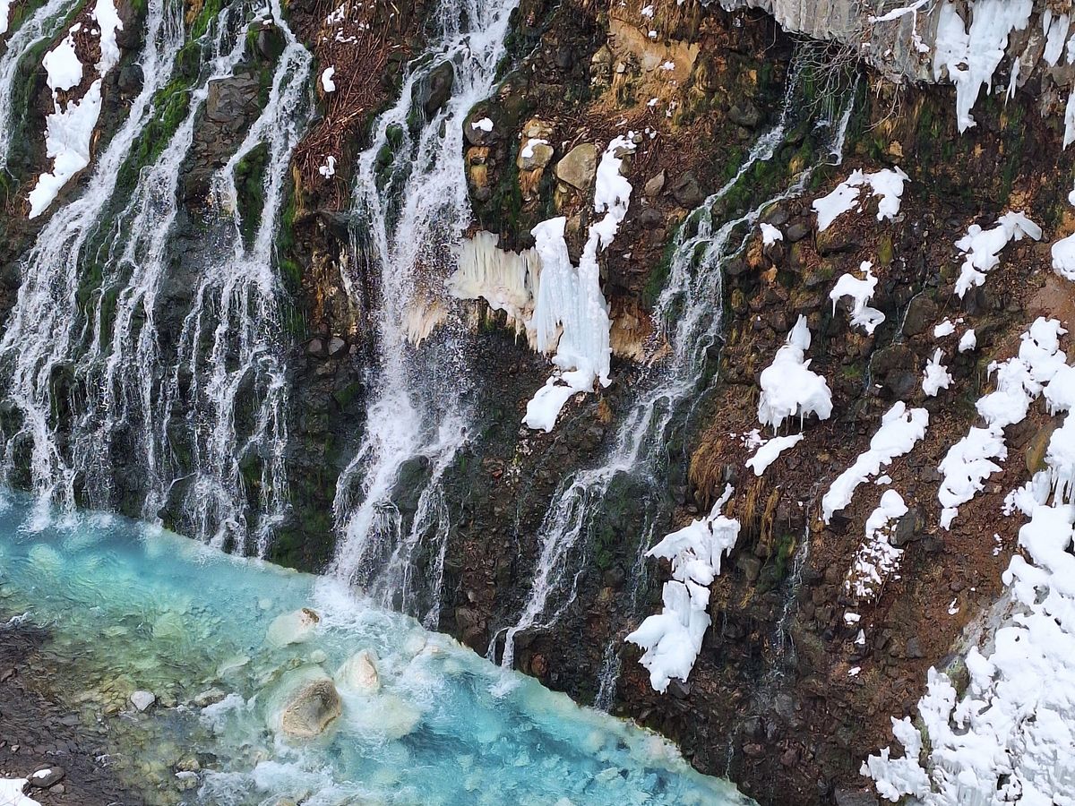 冬なので青い池は雪に埋もれて白い池になっていました。白ひげの滝は青かったです。