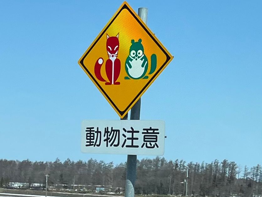 車内で添乗員さんから案内された、北海道内に3カ所しかない標識(赤いきつねと緑のたぬき)をバスから見ることができました。