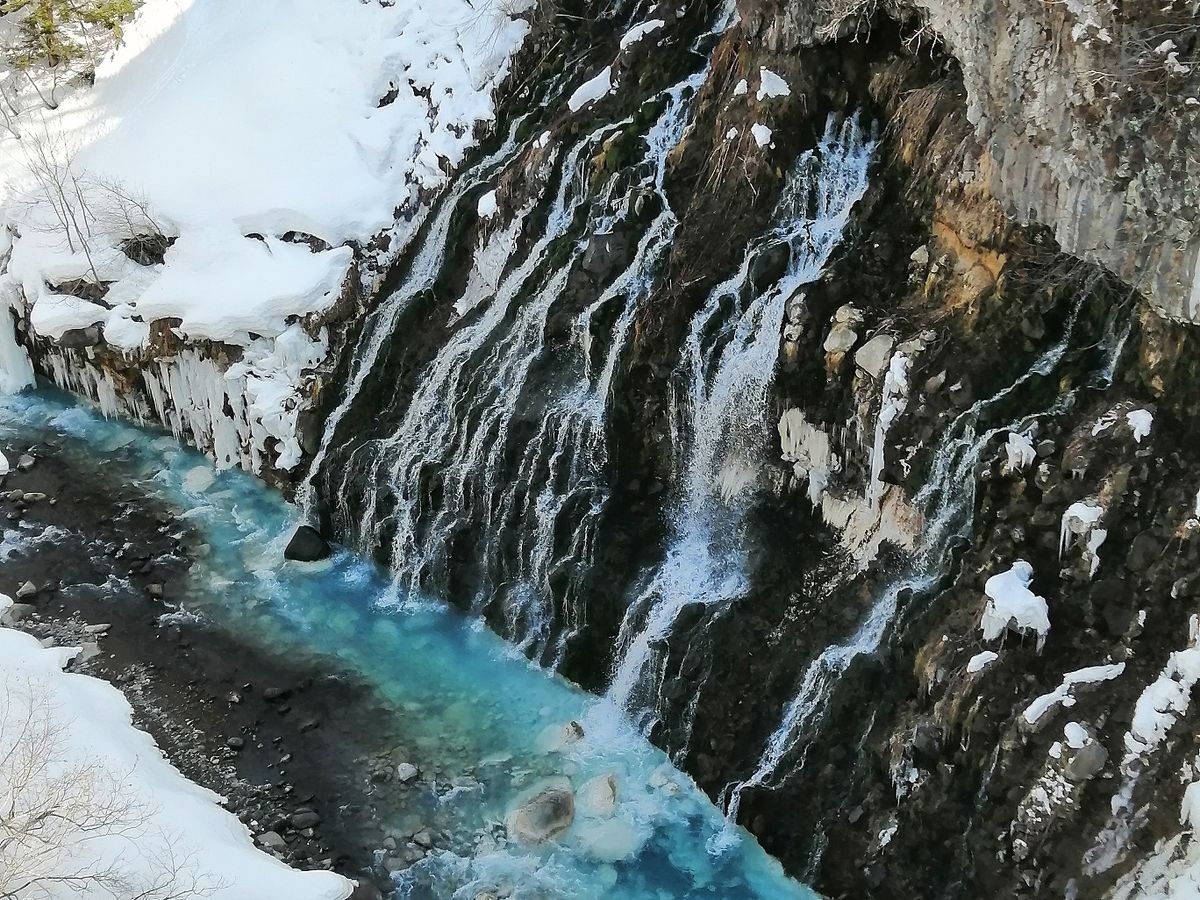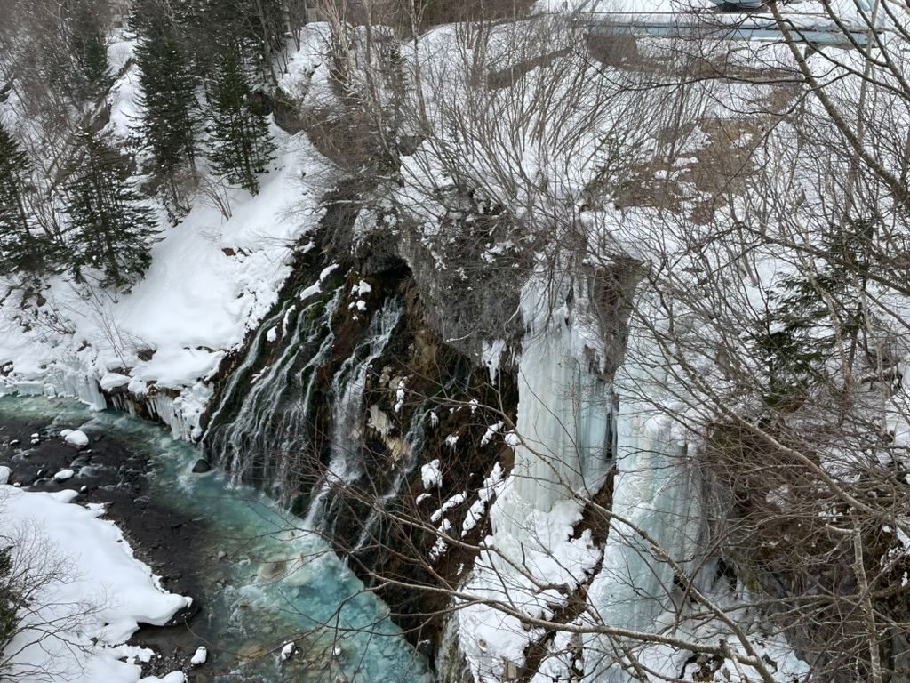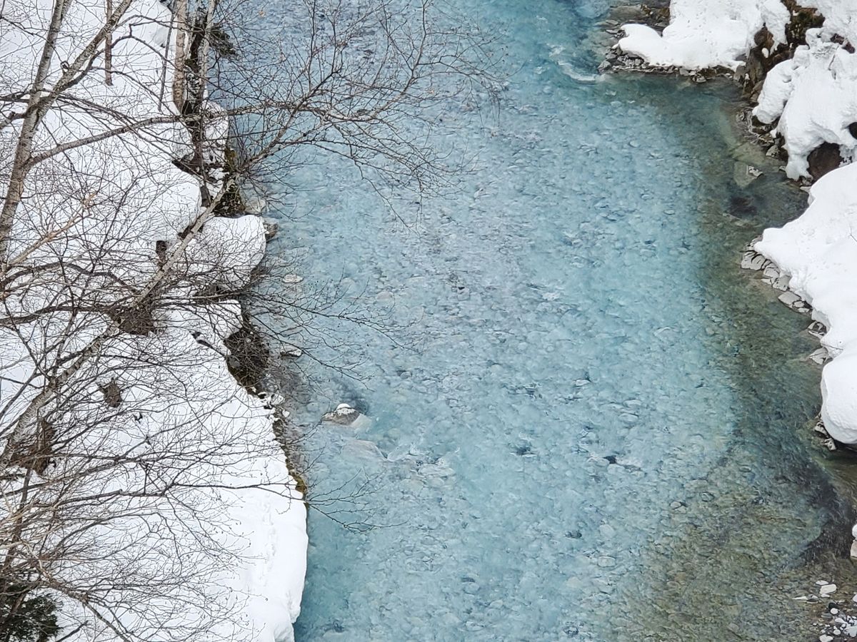 青い池は冬季のため雪原でしたが、その横の川が十分青く見えて、雪原や白樺の木とのコントラストがとても美しかったです。