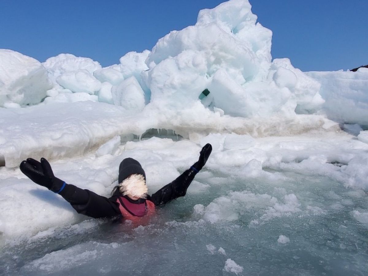 雪(氷)道を歩くことに慣れていなくても、ウエットスーツとガイドさんのおかげで安心して歩けます。