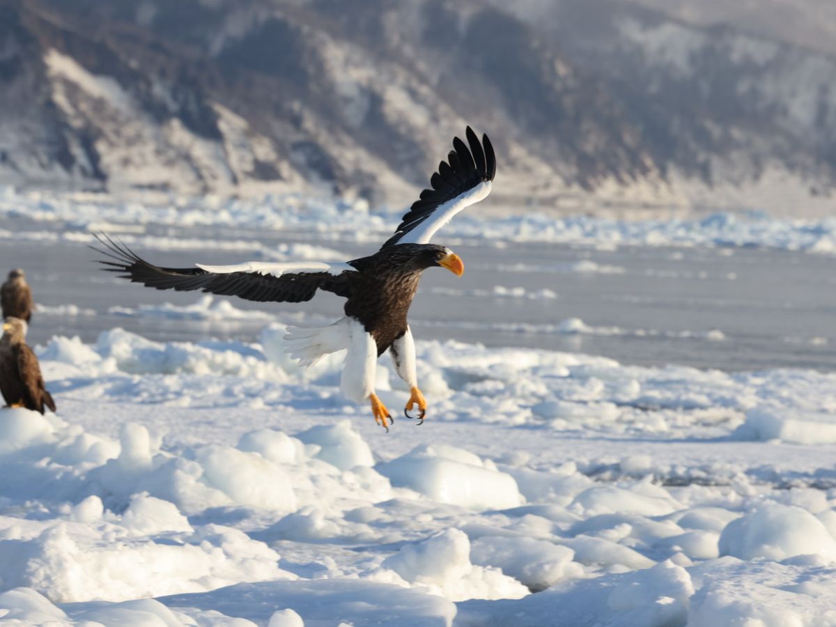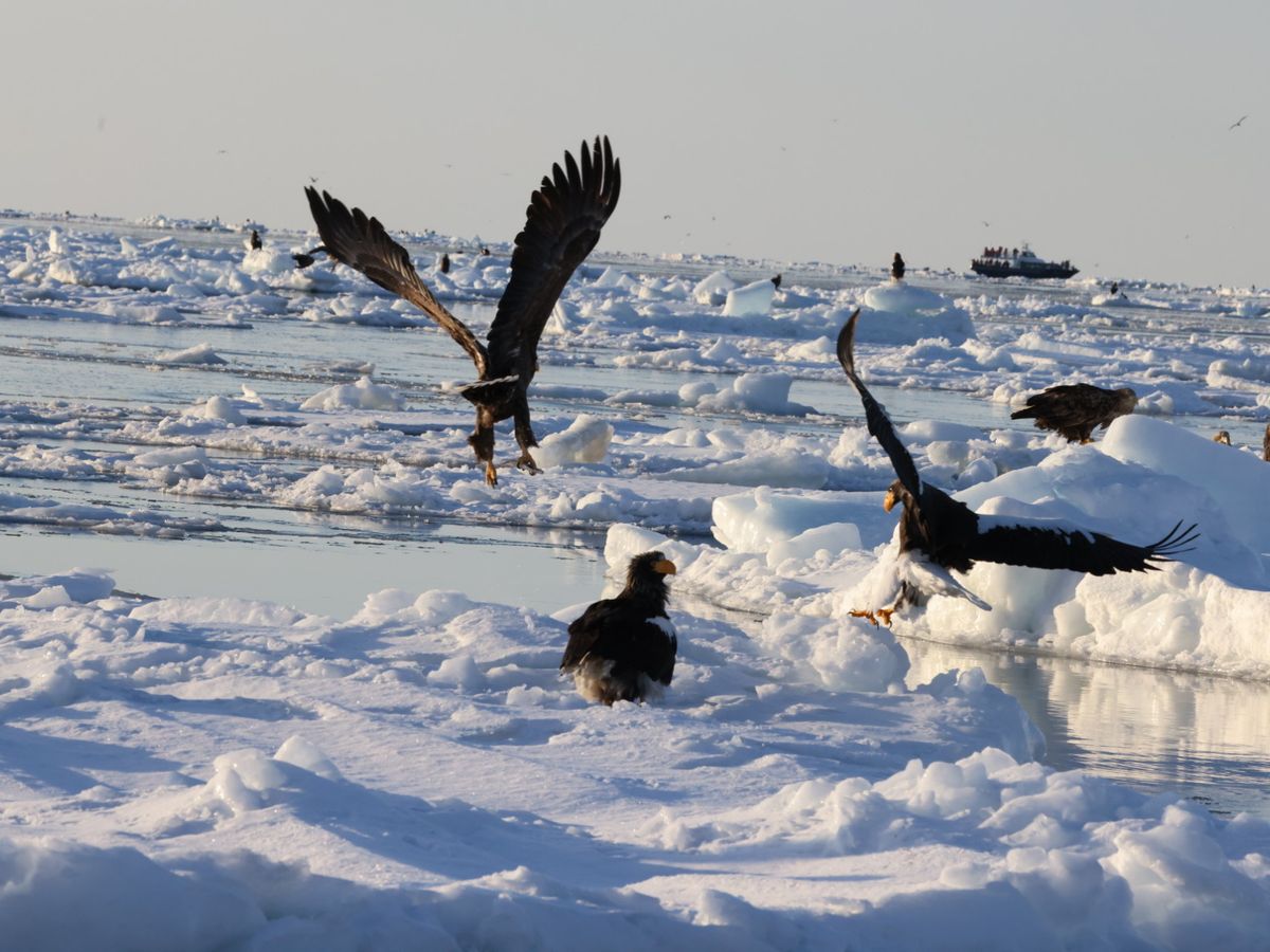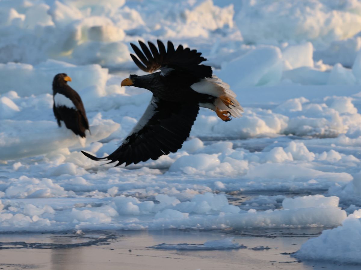 この日は、羅臼港周辺には流氷の姿はなかったのですが、船は、知床半島の北端の方まで足を伸ばしてくれました。そこには、流氷群とその上には、沢山のワシたちが。天気も良く、素晴らしい日の出と、ワシたちを撮影することができました。また、船長も写真撮影のことを意識して、流氷と日の出の太陽の位置を考えて船を動かしてくれました。おかげで初心者の私でも、素晴らしい写真が撮れました。