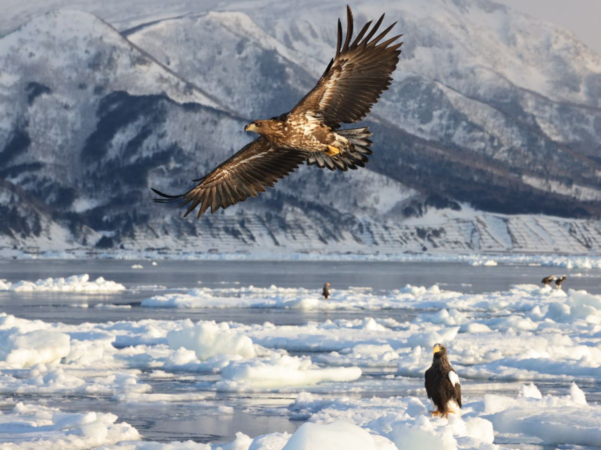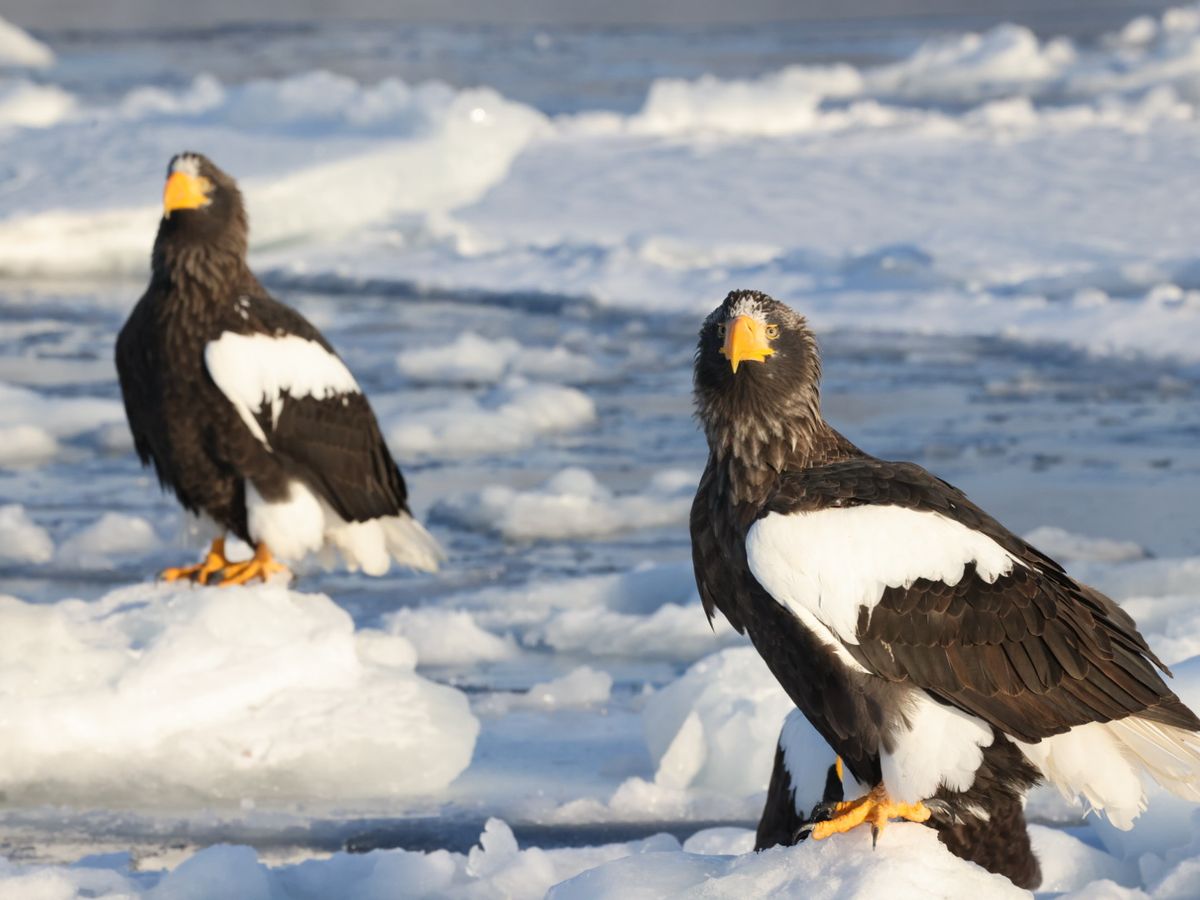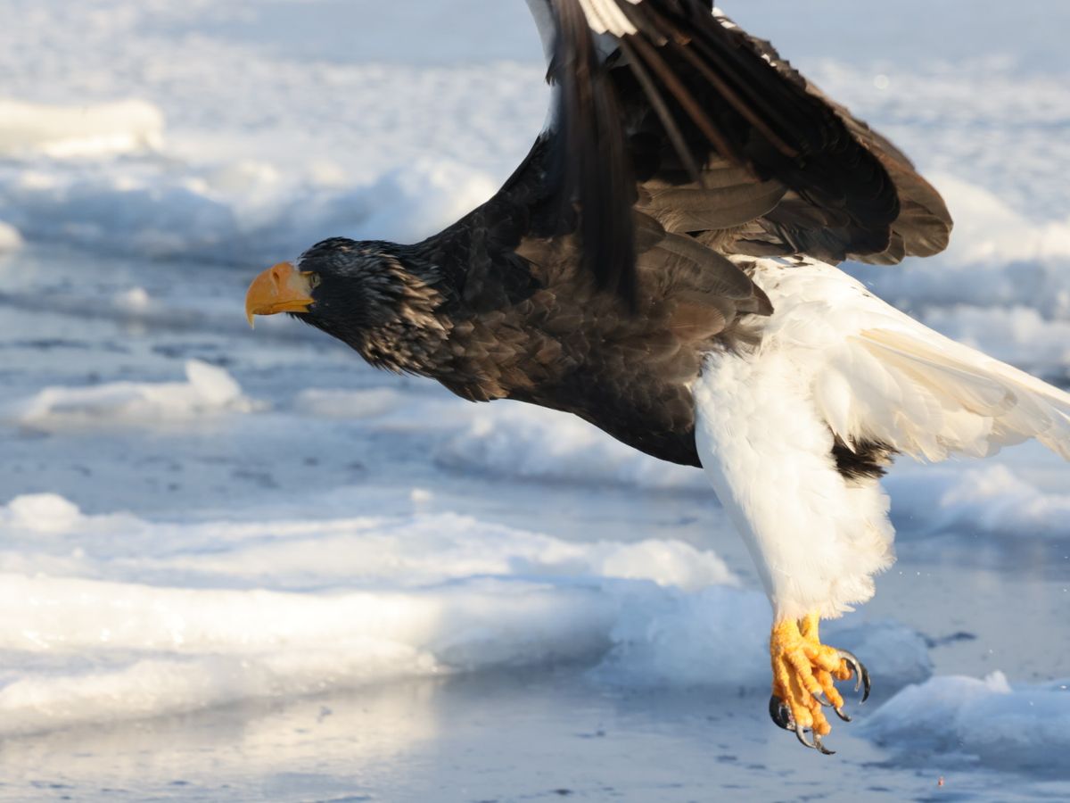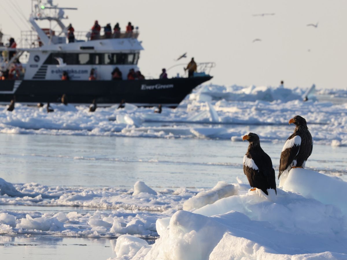 この日は、羅臼港周辺には流氷の姿はなかったのですが、船は、知床半島の北端の方まで足を伸ばしてくれました。そこには、流氷群とその上には、沢山のワシたちが。天気も良く、素晴らしい日の出と、ワシたちを撮影することができました。また、船長も写真撮影のことを意識して、流氷と日の出の太陽の位置を考えて船を動かしてくれました。おかげで初心者の私でも、素晴らしい写真が撮れました。