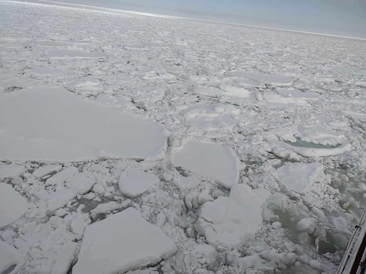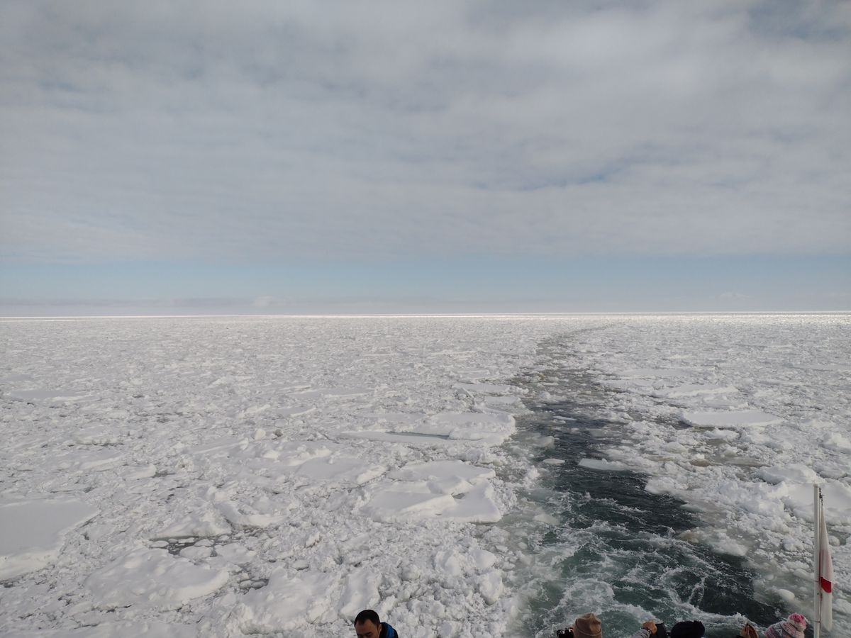 分厚い大きな流氷が海面から湧いてきて、まるで生き物みたいに動きまわります