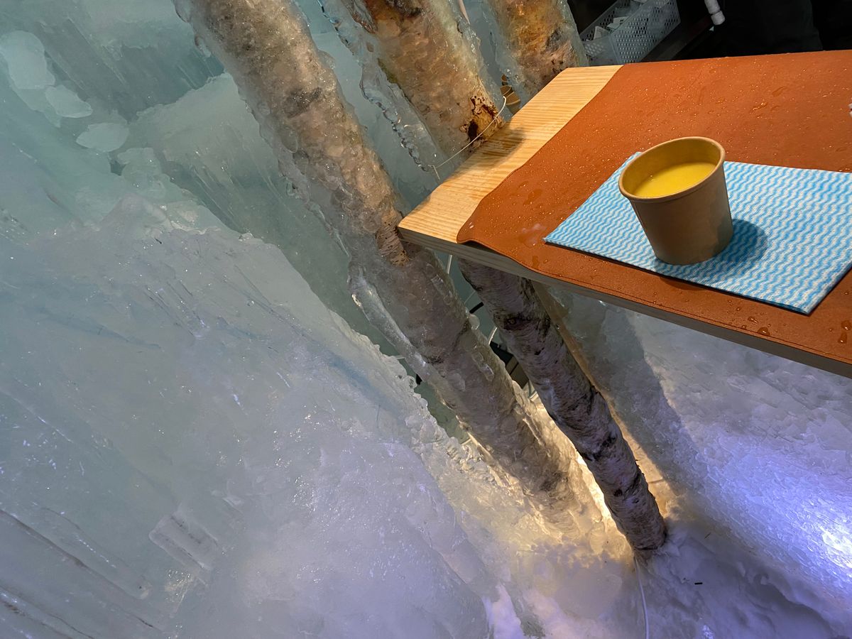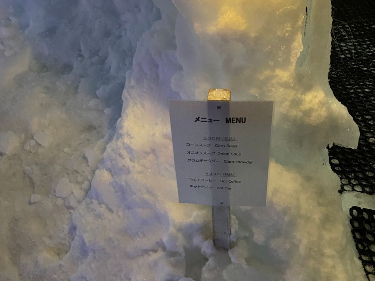 氷濤祭り初日でかなり混んでました。バスは満席で駐車場も車がずらりと並んでましたが、15分ほどで入れました。駐車場から入場まで少しあるくのですがそこで滑りかける人もちらほら。私と子供は全身防寒でボアのブーツを履いていたので寒いとはあまり感じませんでしたが、そこにいた人で足先が冷たい!と言っていた人がいたので足元大事だと思います。以前の口コミで売店が早く閉まるようなことが書かれていたのですが、初日だったからか19時半をまわってもお客さんの列が出来ていてバスに戻る前でも購入出来ました。売店は電子マネーなど色々支払い方法がありましたが、会場の中にあったスープのお店は現金のみでした。メニューはクラムチャウダー、コーンスープ、オニオンスープ、ホットコーヒー、ホットティーでした。スープ500円ドリンク400円です。氷の中のお店なのですが、上から雫がポタポタと落ちてきたりするのでお店の外で飲みました。