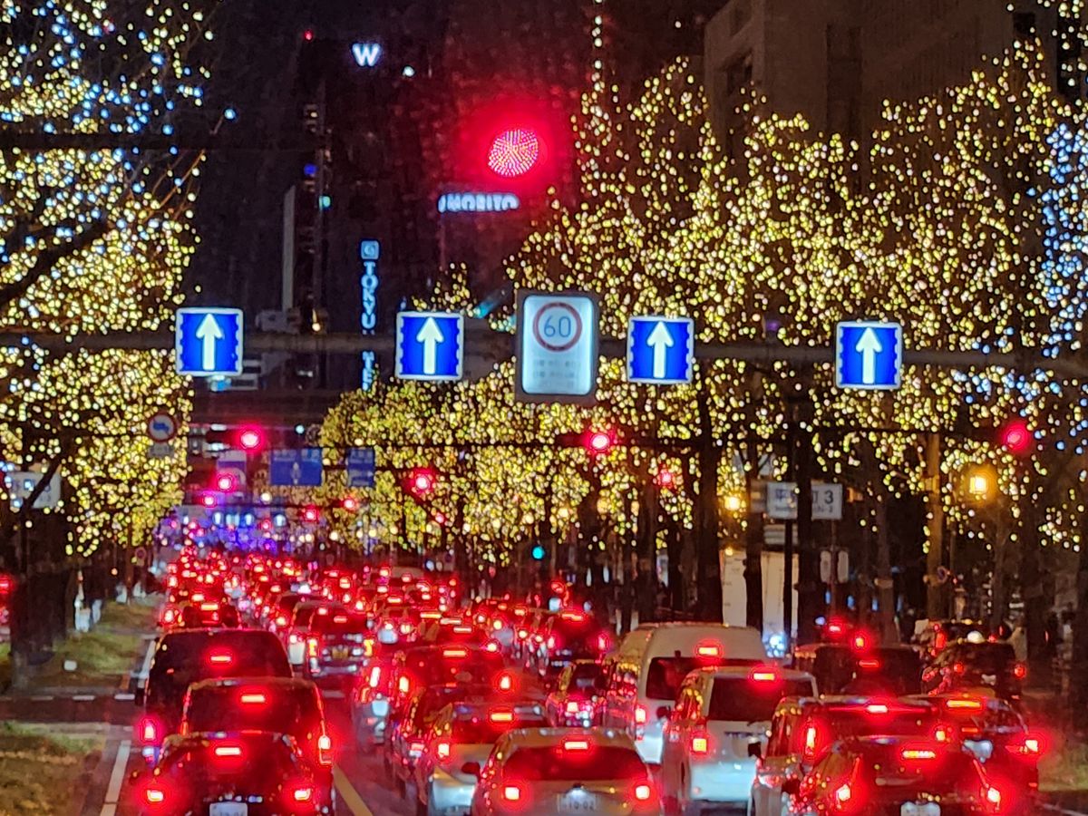 イブで大渋滞の御堂筋。ドライバーさんも大変ですが、動かないバスの中で、大阪の興味深いお話を、途切れることなく、ご紹介くださるガイド添乗員さんは、素晴らしかった‼️ 普段ならあっという間の御堂筋を1時間ぐらい、ゆっくり見せて貰いました。